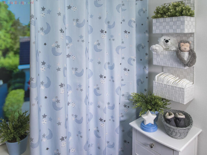 Wat een schitterende kwaliteit gordijnstof! Zien is geloven, zo mooi soepel geweven én maar liefst 280 cm breed! Dat betekent dat het babykamer gordijn meestal naadloos kan worden gemaakt. De is print is gedrukt op een heel fijn geribde stof, wat een vlotte & sportieve uitstraling geeft. Het sterretjes & maantjes patroon is leverbaar in 3 verschillende ondergrondkleuren. Eigentijds blauw- grijs voor de jongenskamer, pastel roze - grijs voor meisjes slaapkamer en camel – grijs voor als je liever geheim wilt houden welk lief kleintje er komt slapen. De maan is hier 7 cm groot en samen met de sterren ernaast 9 cm breed. Door het rustig herhalende patroon kan je dit gordijn uitstekend tot de grond laten confectioneren. Wanneer je graag extra verduistering wenst dan optie voeren aanvinken in het bestelproces. Kortom, deze fraaie stofserie is een aanwinst binnen onze enorme collectie!