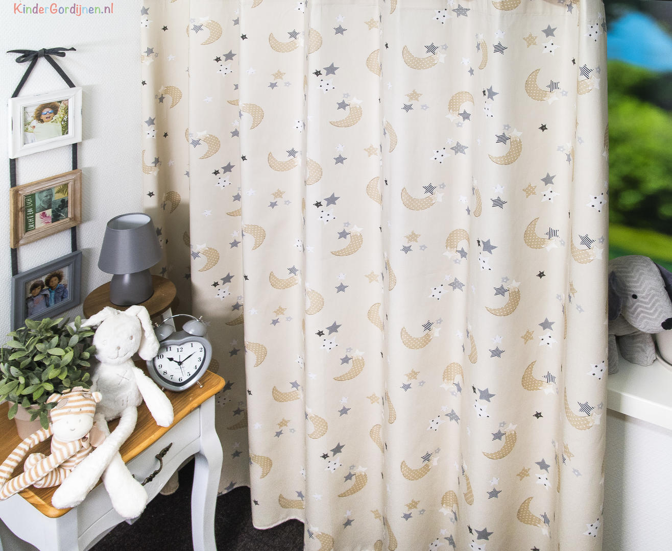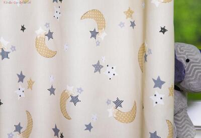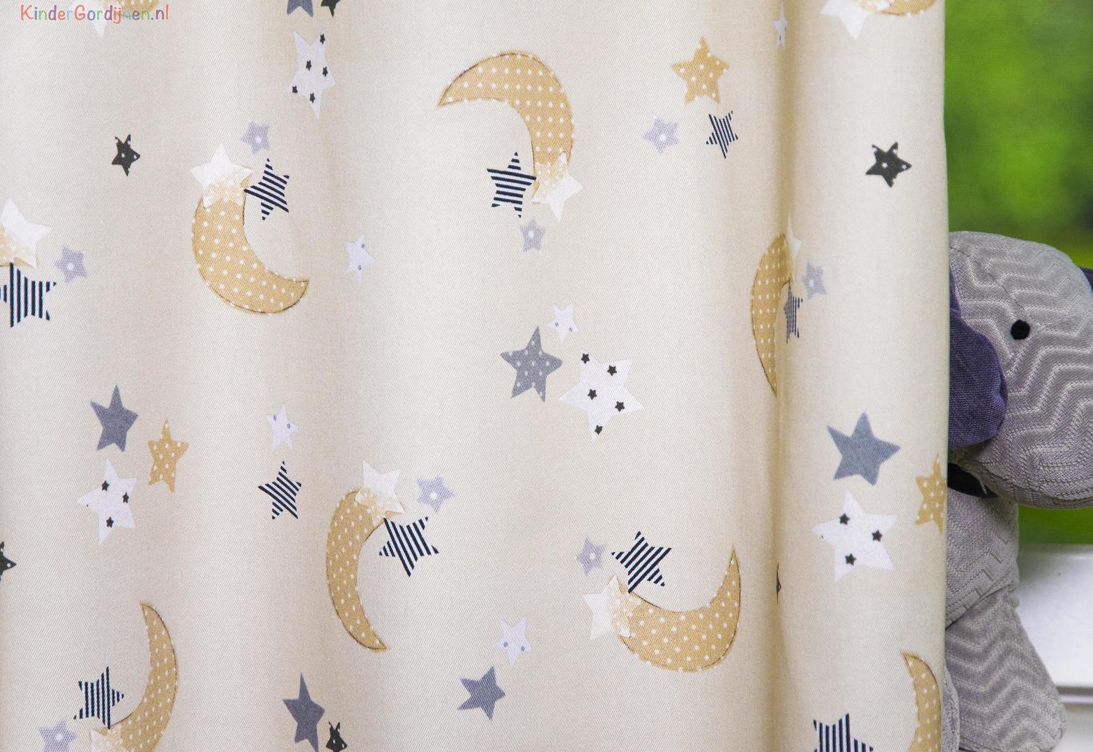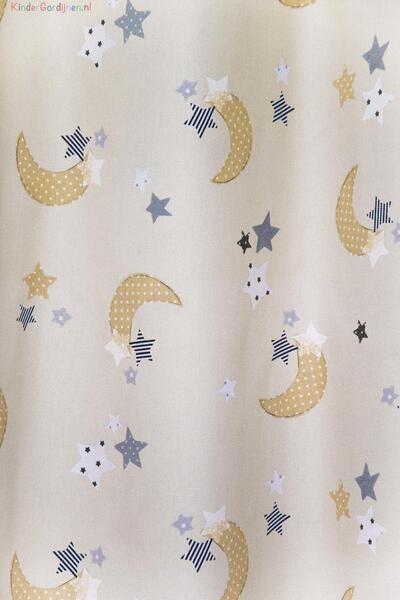 Wat een schitterende kwaliteit gordijnstof! Zien is geloven, zo mooi soepel geweven én maar liefst 280 cm breed! Dat betekent dat het babykamer gordijn meestal naadloos kan worden gemaakt. De is print is gedrukt op een heel fijn geribde stof, wat een vlotte & sportieve uitstraling geeft. Het sterretjes & maantjes patroon is leverbaar in 3 verschillende ondergrondkleuren. Eigentijds blauw- grijs voor de jongenskamer, pastel roze - grijs voor meisjes slaapkamer en camel – grijs voor als je liever geheim wilt houden welk lief kleintje er komt slapen. De maan is hier 7 cm groot en samen met de sterren ernaast 9 cm breed. Door het rustig herhalende patroon kan je dit gordijn uitstekend tot de grond laten confectioneren. Wanneer je graag extra verduistering wenst dan optie voeren aanvinken in het bestelproces. Kortom, deze fraaie stofserie is een aanwinst binnen onze enorme collectie!