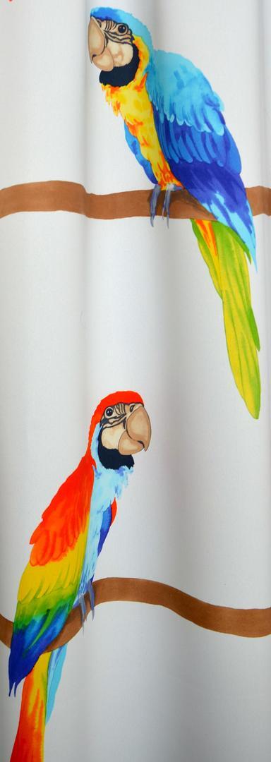Creëer een zomerse sfeer in de kinderkamer met deze prachtige felgekleurde papegaaien op de gordijnen.