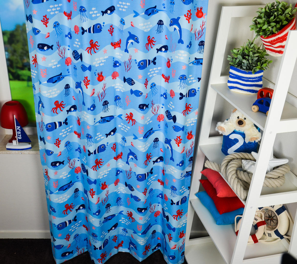 Onderwaterwereld voor je slaapkamerraam, dat is COOL! Van vreemde diepzee vissen tot een vrolijke dolfijn. Meneer inktvis is hier 7 cm groot en allemaal gedrukt op sportieve ietwat geruwde stof. Door de gekozen kleurcombinatie zowel geschikt voor de jongens- als meisjeskamer. Het ‘zee thema’ kan je uitbreiden met leuke accessoires. Een bijpassend kussen van dezelfde stof kan óók. Voor verduistering graag voeren.