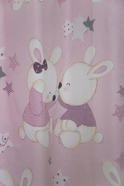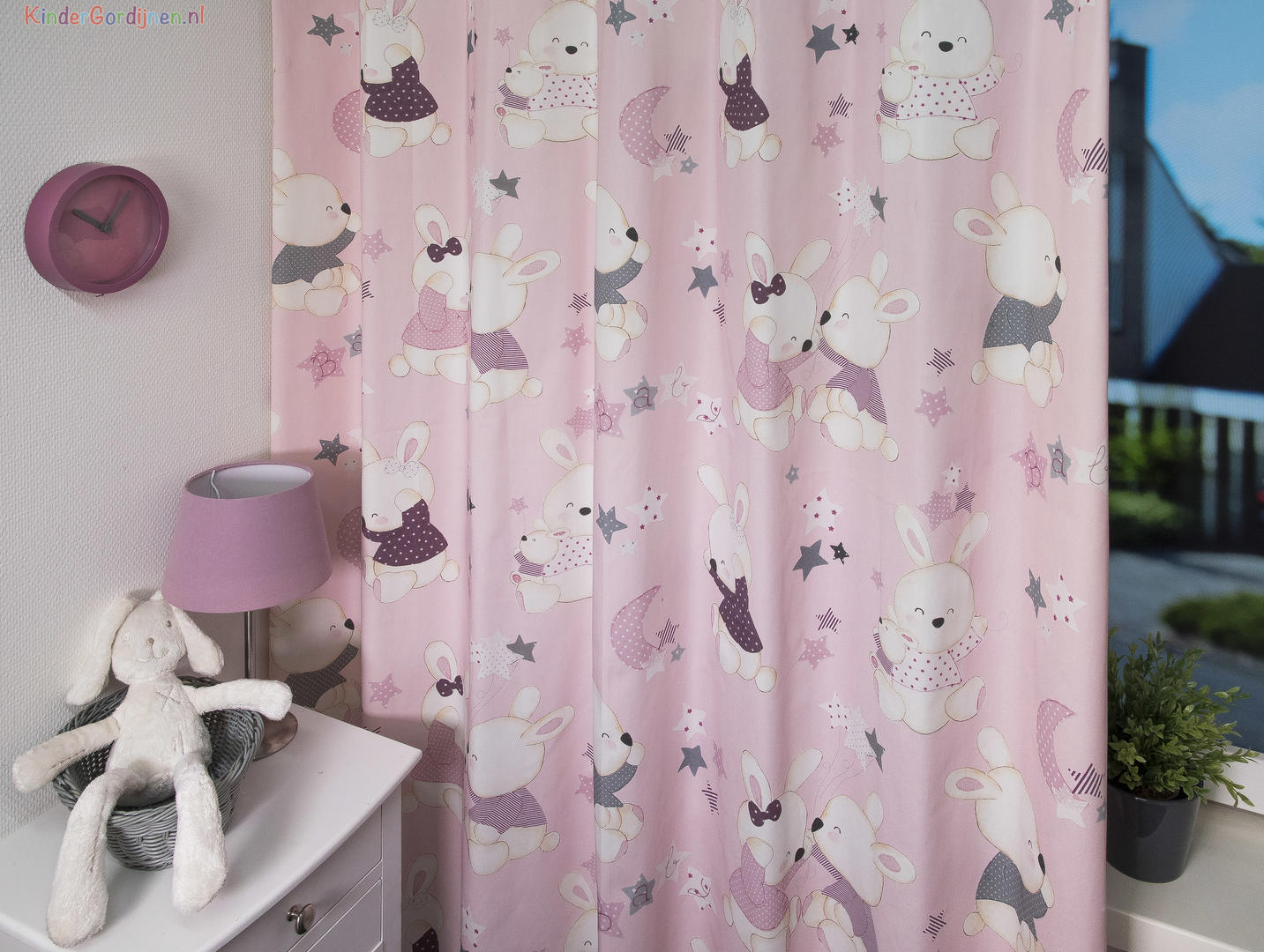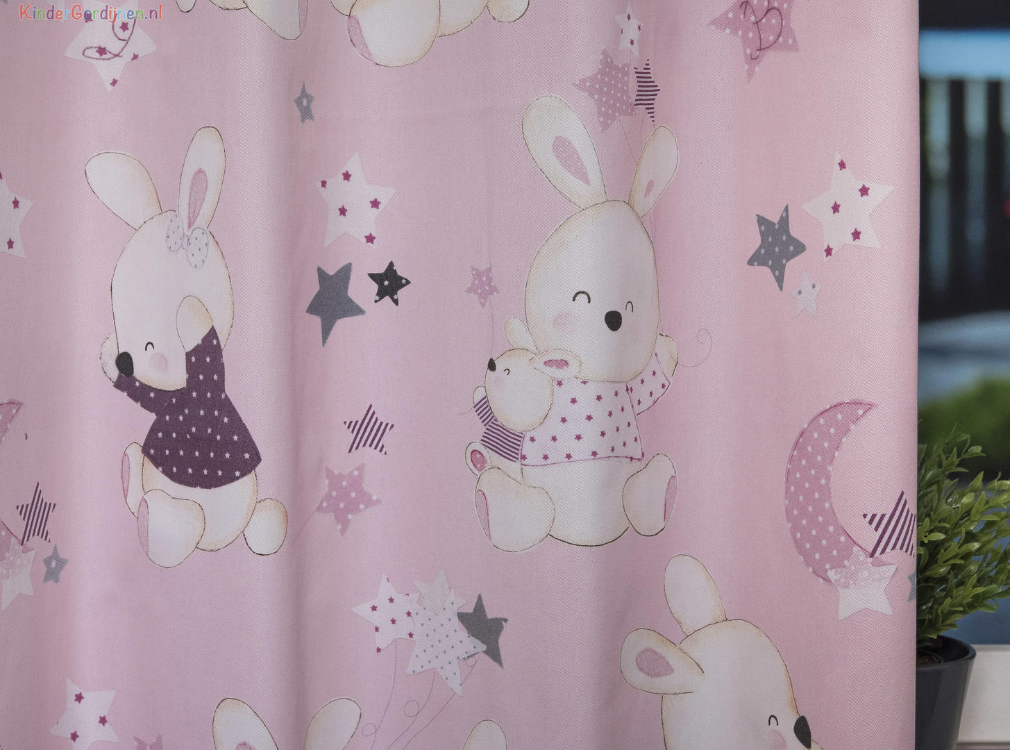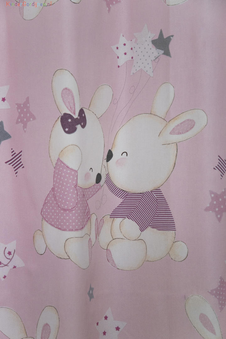Wat een schitterende kwaliteit gordijnstof! Zien is geloven, zo mooi soepel geweven én maar liefst 280 cm breed! Dat betekent dat het babykamer gordijn meestal naadloos kan worden gemaakt. De schattige konijnen print is gedrukt op een heel fijn geribde stof, wat een vlotte sportieve uitstraling geeft. De babykonijntjes zijn op de voorzijde gedrukt, maar liefst 30 cm groot en leverbaar in 3 verschillende ondergrond kleuren. Eigentijds vergrijsd blauw voor de jongenskamer, pastel roze voor meisjes slaapkamer en warm camel-grijs voor als je liever geheim wilt houden welk lief kleintje er komt slapen. Door de royale print kun je het gordijn uitstekend tot de grond laten confectioneren. Wanneer je extra verduistering wenst, graag optie voeren aanvinken in het bestelproces. Kortom, deze fraaie stofserie is een aanwinst binnen onze enorme collectie!