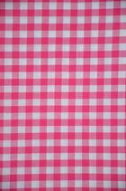Dit overgordijn met neutraal ruitmotief is leverbaar in veertien verschillende kleuren. De ruit is ongeveer 1,5 centimeter.
