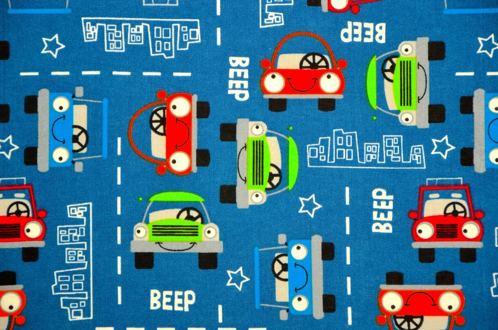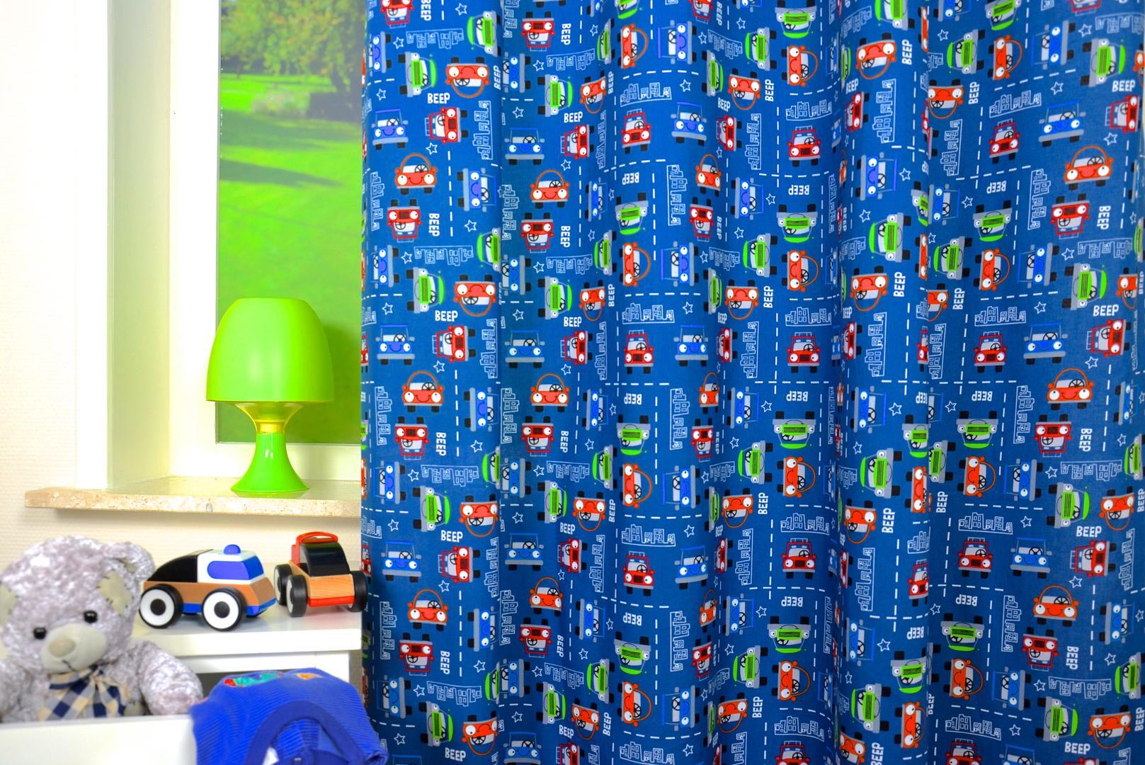 Vrolijke jongens gordijnen ‘Beep in the city’. De autootjes zijn 4 cm groot en vrij strak grafisch verdeeld over de lichtdoorlatende stof. Dat geeft een rustig effect. De ondergrondkleur is donkerblauw. Autootje Beep heeft grappige koplampoogjes, die lachend je kamer inkijken. “Beep – Beep, mag ik een rondje door jou huis rijden?” Om het auto thema compleet te maken zijn er ook kussentjes te bestellen van dezelfde stof