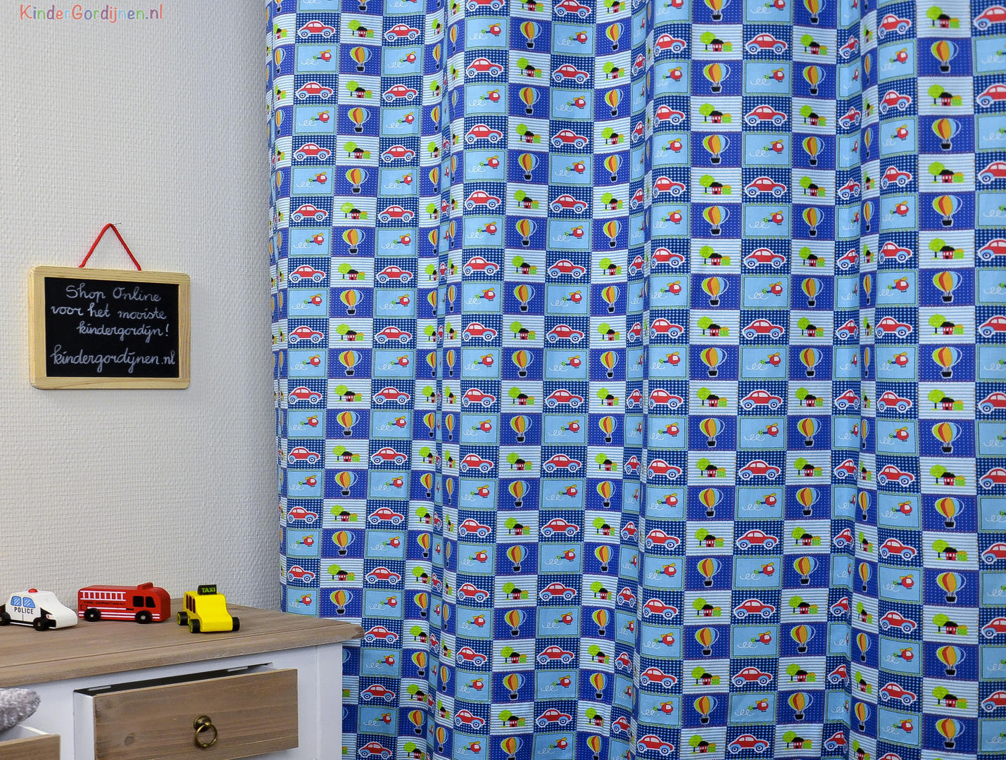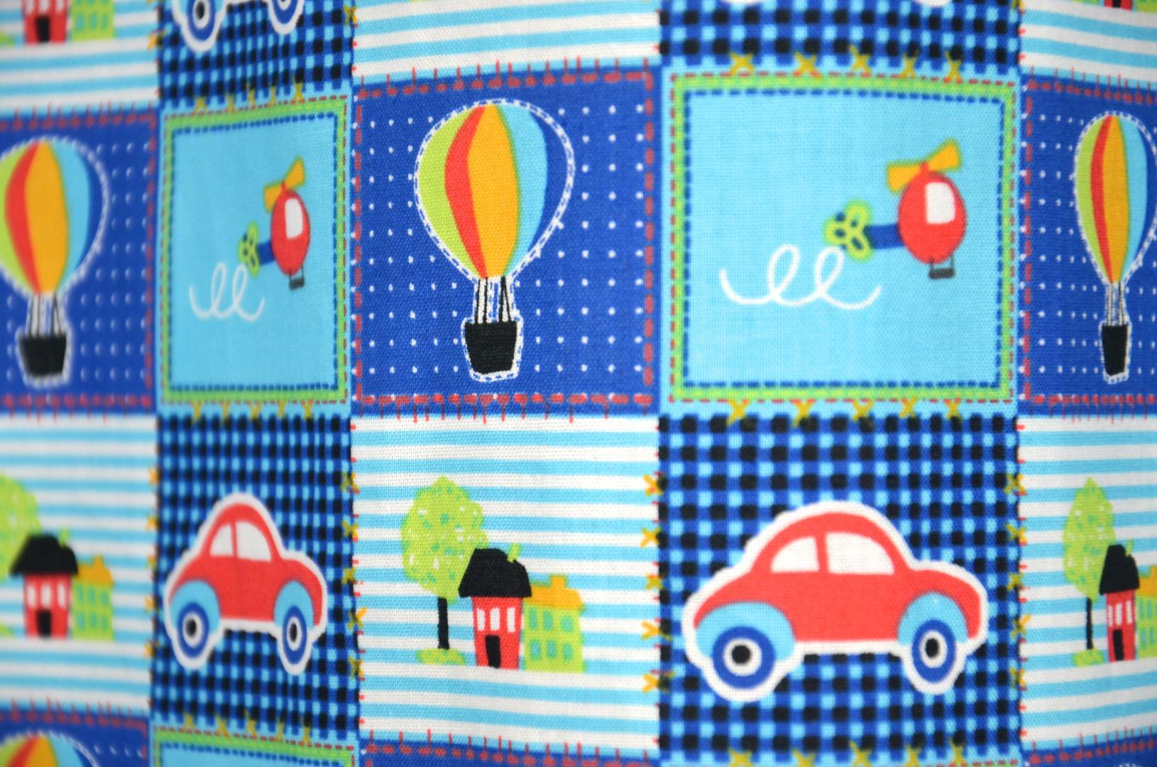 Vrolijk patchwork gordijn voor uw jonge zoontje versierd met auto's, luchtballonen en helikopters. Deze gordijnen maken elke kinderkamer tot een gezellige plek om uren te spelen of lekker weg te doezelen.