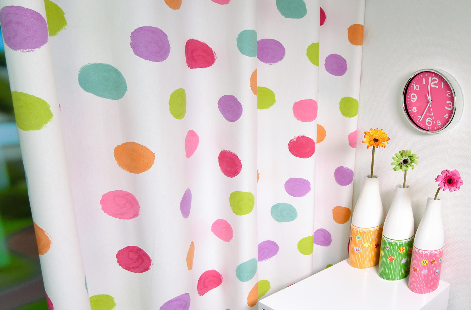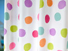 STIPPEN zijn HIP! En dit gordijn heeft royale stippen in héérlijke heldere, frisse kleuren. De stip is 7 cm in doorsnede en heeft het effect alsof zij met de kwast aangebracht zijn. Dat geeft een speels en kleurrijk effect. De ondergrond is een warm witte, dicht geweven stof, die desgewenst verduisterend gevoerd kan worden. Je kunt dit gordijn heel leuk combineren met een pittige muurverfkleur. Ook de hippe ‘ceyladon’ tint past hier uitstekend bij! Succes bij de meiden gegarandeerd!