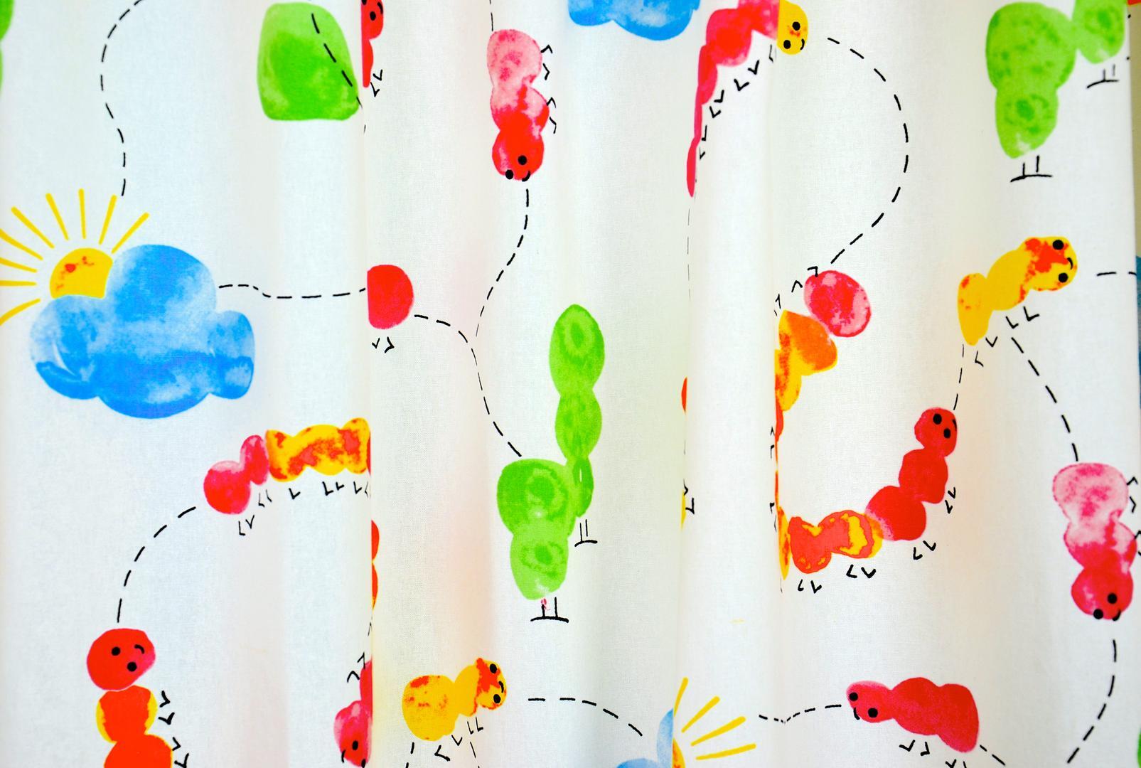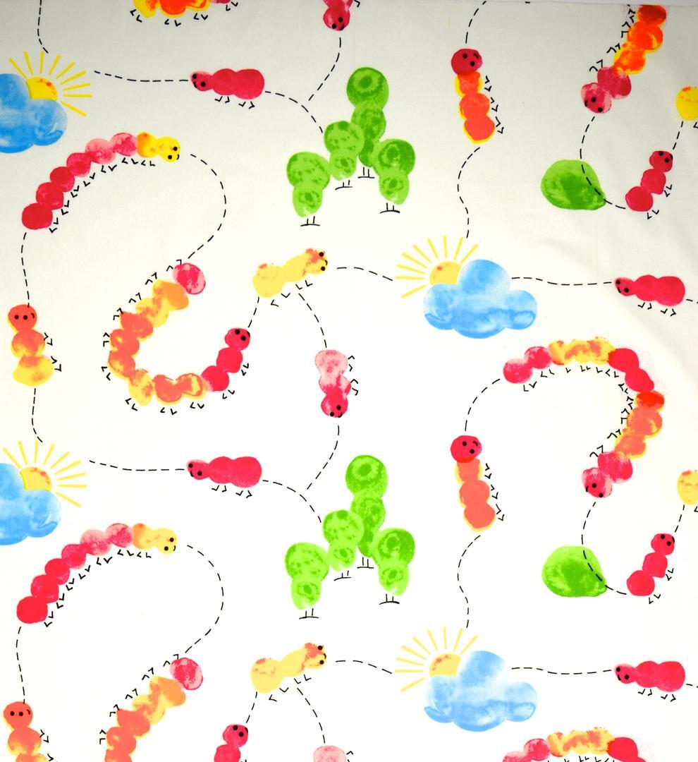 Rupsje, rupsje, eet je rond en rond. Smul maar lekker, bladeren zijn gezond! Deze goedlachse rupsjes zijn krullend aan het rondstappen en vormen zo fraaie figuren. De kleuren zijn vrolijk en divers. De print gedrukt op roomwitte dicht geweven ‘kaasdoek-look’ stof. Dat geeft een mooi natuurlijk effect. Voor verduistering even extra voeren.