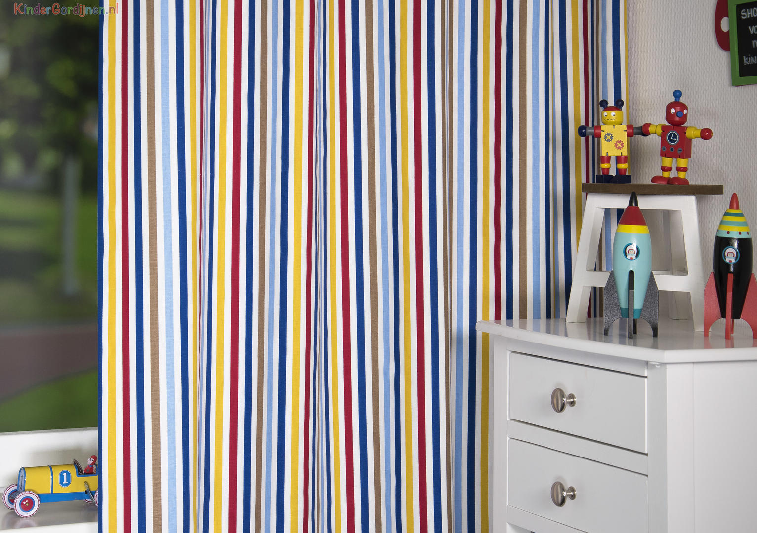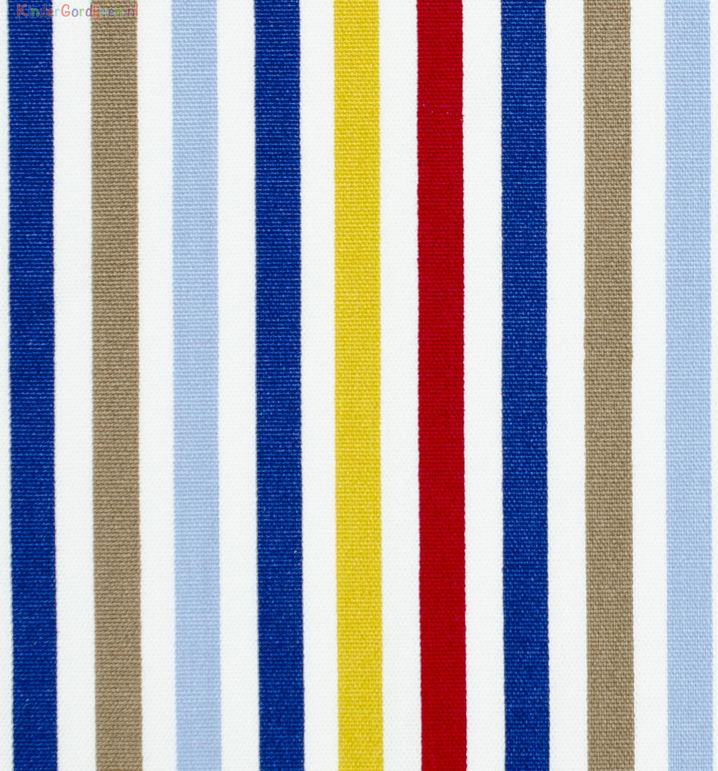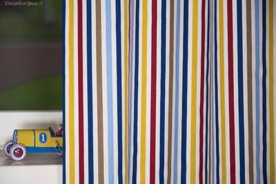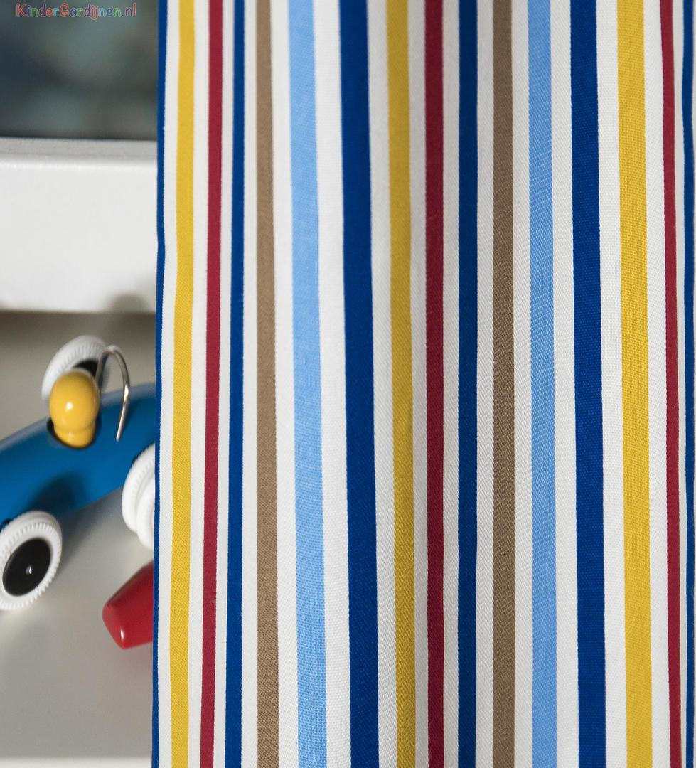 De strakke lijnen van dit kindergordijn zorgen voor een kleurrijke en tegelijkertijd stijlvolle uitstraling. Het gordijn heeft een witte ondergrond en lijnen in de kleuren lichtblauw en donkerblauw, rood, okergeel en bruin. Leuk om te combineren in de jongenskamer of meisjeskamer met kleuren in deze tinten of met een witte kamer. Het kan lang mee, want het is geschikt voor jongens en meisjes van alle leeftijden. Dit 100% katoenen kindergordijn kan indien gewenst verduisterend worden geleverd.