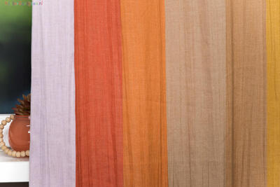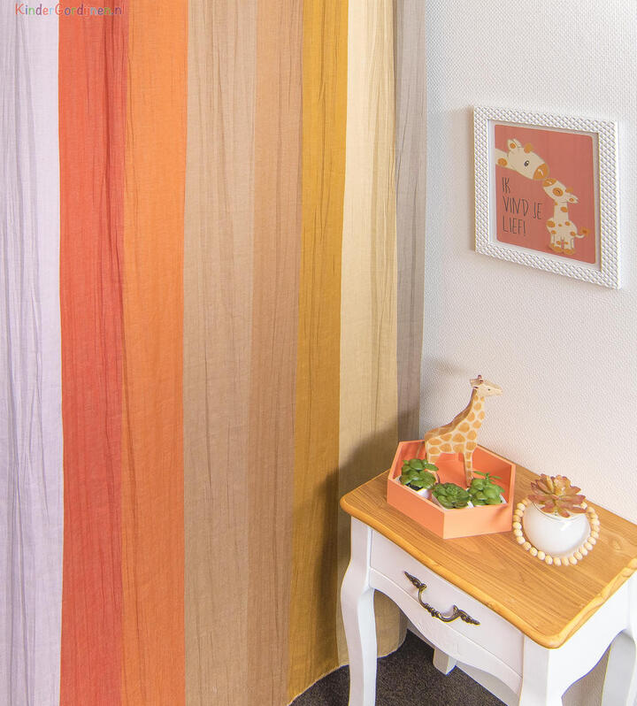 Luxe soepel vallende, iets transparant doorschijnende gordijnstof met lengtestreep dessin. De kleuren verlopen scherp over de breedte van de stof en worden onderbroken door een als plissé geweven lengtestreep.