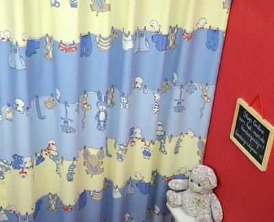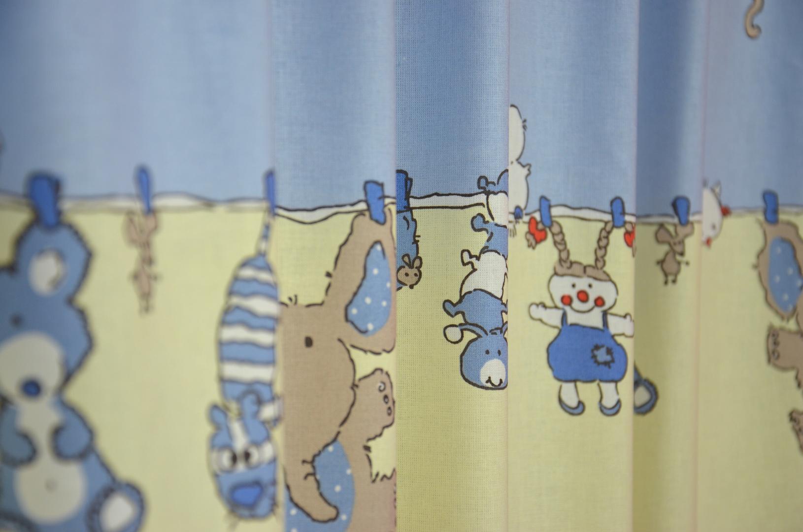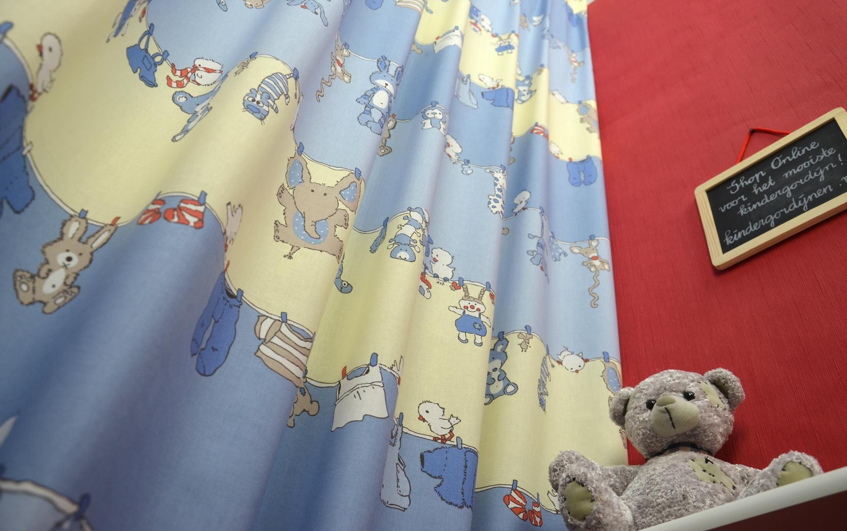 Op dit aandoenlijke babygordijn hangen de knuffels samen met hun kleertjes aan de waslijn. Het gordijn is verkrijgbaar in zachtroze en lichtblauw en daarmee geschikt voor zowel jongetjes als meisjes.