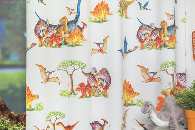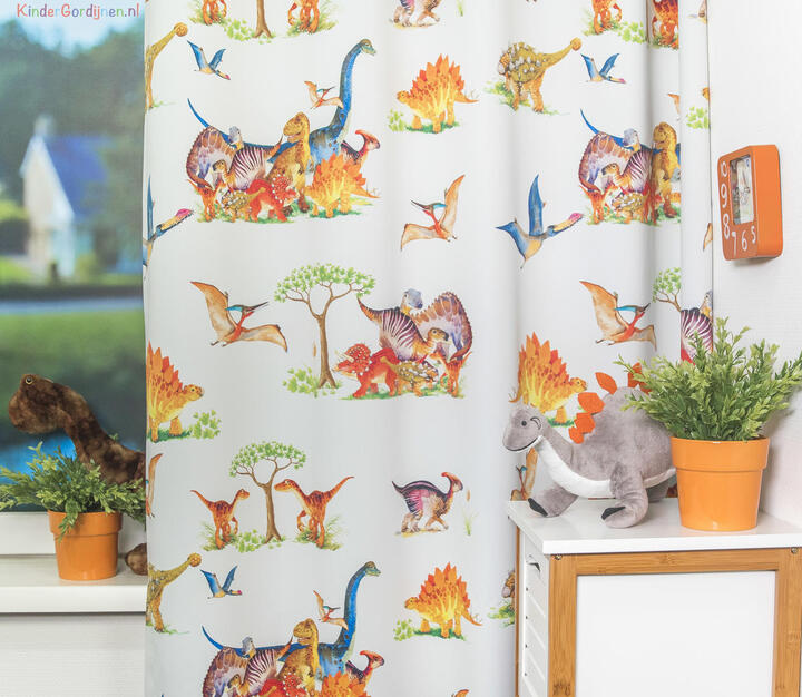 Een prachtig gordijn voor je raam! Als jij je eigen gordijnen kiest, wordt het helemaal jouw kamer. Deze gordijnstof met de naam Dinos (verduisterend) is gemaakt van de beste materialen waardoor het gordijn mooi in de plooi valt. Het aantal te gebruiken banen gordijnstof van 140 cm breed wordt door ons vakkundig aan elkaar geconfectioneerd zodat het dino's patroon van 75 cm mooi doorloopt. Laat voor een aangename isolatie en extra verduistering de gordijnen voeren: een verschil van dag en nacht!