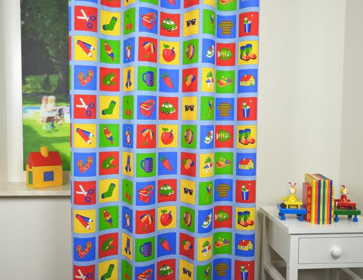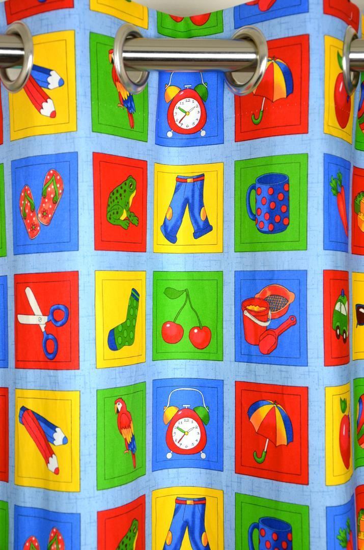 Vrolijk kindergordijn ontworpen door Monica Maas met zomerse taferelen. De felle kleuren en verschillende afbeeldingen zorgen voor een levendige kinderkamer. Het kindergordijn is geschikt voor zowel voor jongetjes als meisjes.