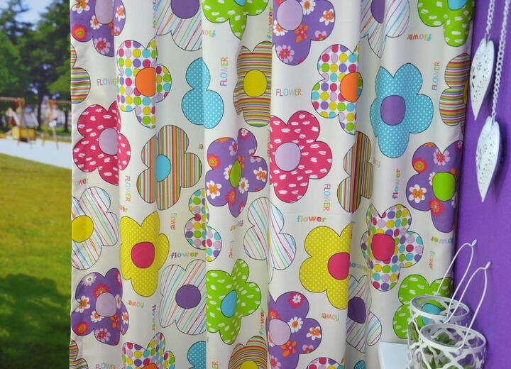 Strepen, stippen, rondjes: de bloemen op dit fleurige zachte gordijn zijn allemaal anders ingevuld.