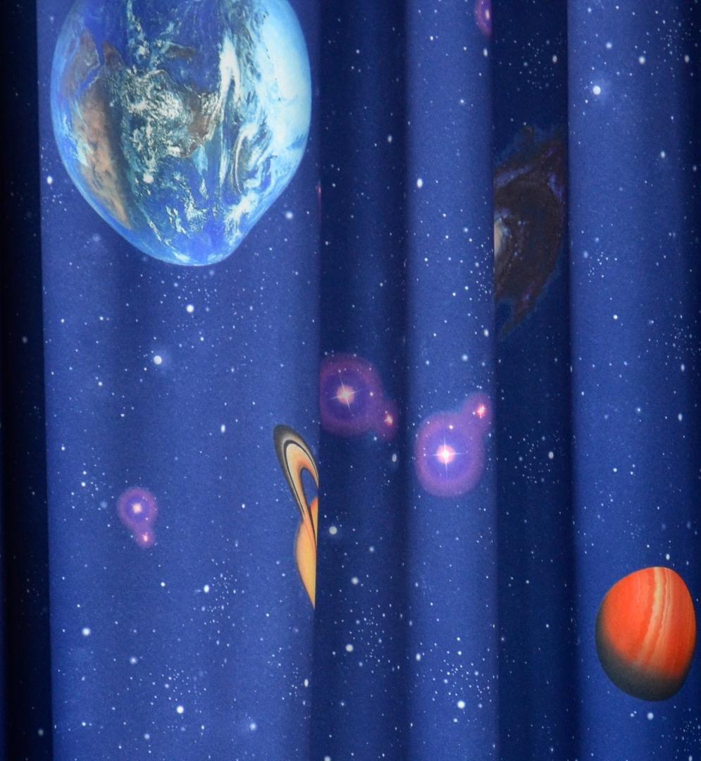 Planeten, sterren en zonnestelsels zijn eigenlijk alleen in de nacht goed te zien. Daarom zijn deze heelal gordijnen vooral uitgevoerd in een donkerblauwe of nachtblauwe kleur. Op de sterrenstelsel gordijnen staan afbeeldingen van sterren, verschillende planeten, een zonnestelsel en natuurlijk de aarde. Deze zijn in natuurgetrouwe kleuren uitgevoerd. Dankzij de neutrale kleuren past het Galaxy gordijn bij verschillende interieurstijlen en kleuren. Het gordijn is geschikt voor zowel jongens- als meisjeskamers.