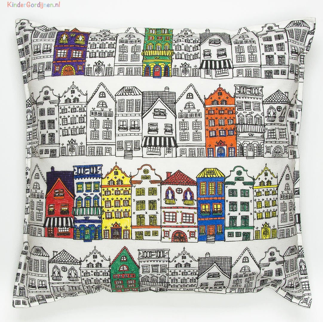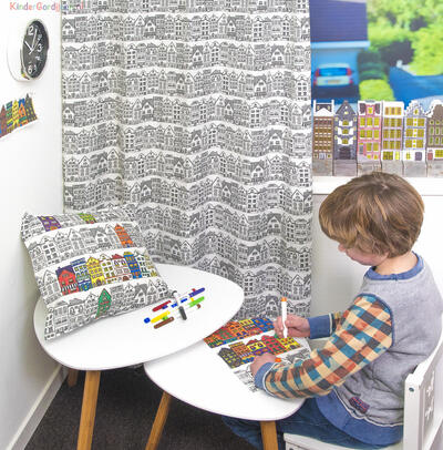 Hoe leuk is dit! zelf met textielstiften je eigen gordijn inkleuren. De huisjes zijn zo'n 10cm hoog. Hoeveel huisjes kleur jij per dag?