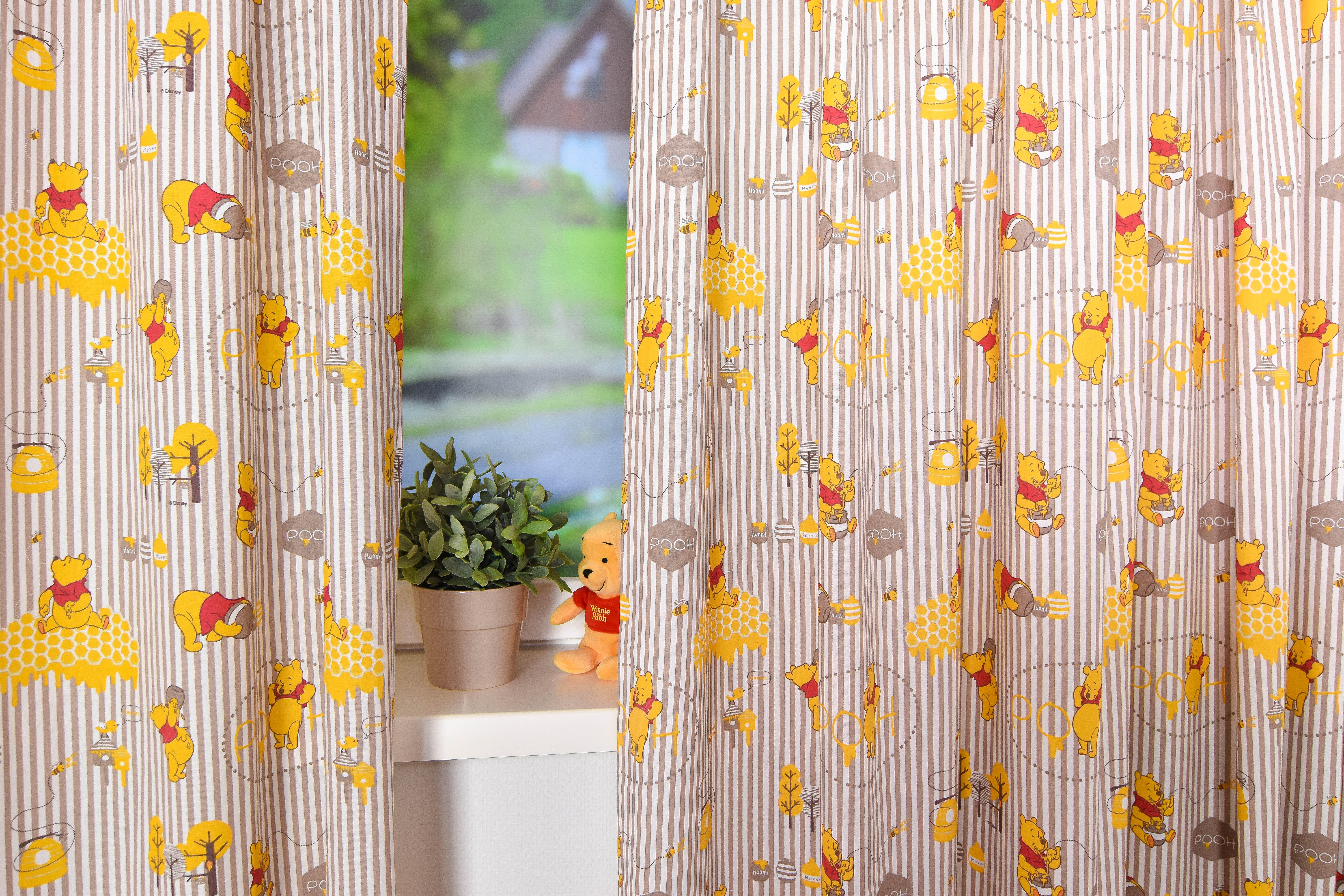 Dat Winnie de Poeh dol is op honing wordt nu wel heel snel duidelijk... Laat uw kinderen lekker spelen op de kinderkamer terwijl Winnie een pot honing leegsnoept. KinderGordijnen.nl kan de katoenen gordijnstof voeren tot een verduisterend kindergordijn.