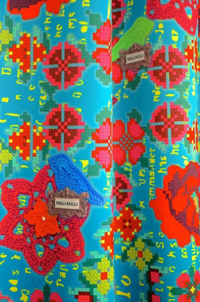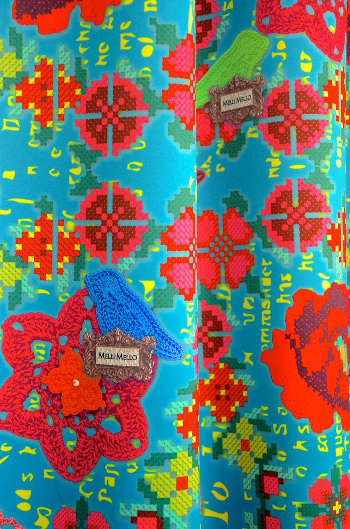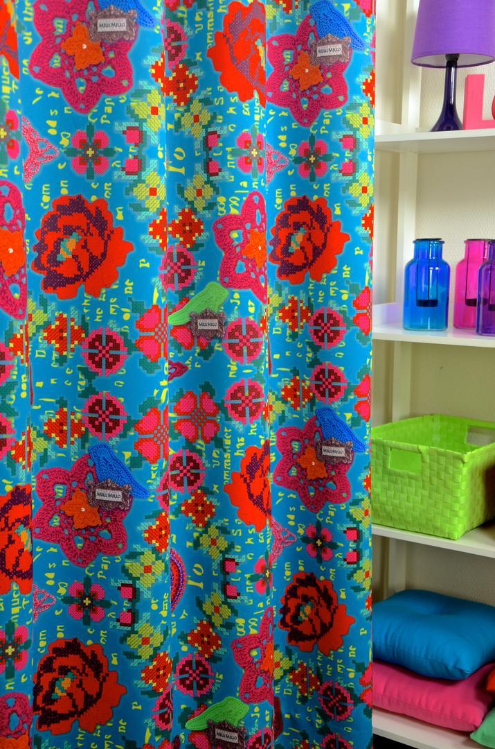 Een uniek gordijn van het HIPPE merk MELLI MELLO! Het is vrolijk, kleurrijk en met een prachtige aqua-blauwe ondergrondkleur. De prints zijn op een semi verduisterende stof gedrukt, waardoor het gordijn de slaapkamer prettig donker maakt. De achterzijde is egaal gebroken wit. Het patroon stelt fraai haakwerk en breisels voor, wat een warme textuurlook geeft. De paars-roze ster is 18 cm groot. Dit is een echte eyecatcher voor jouw meidenkamer!
