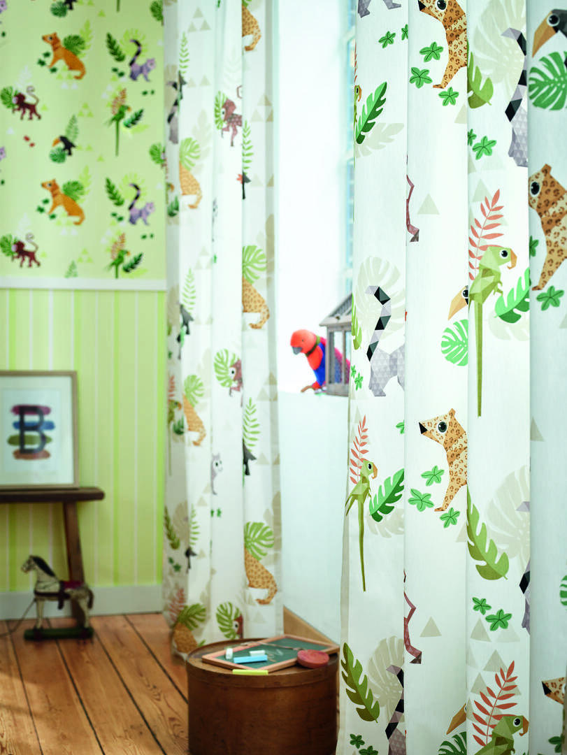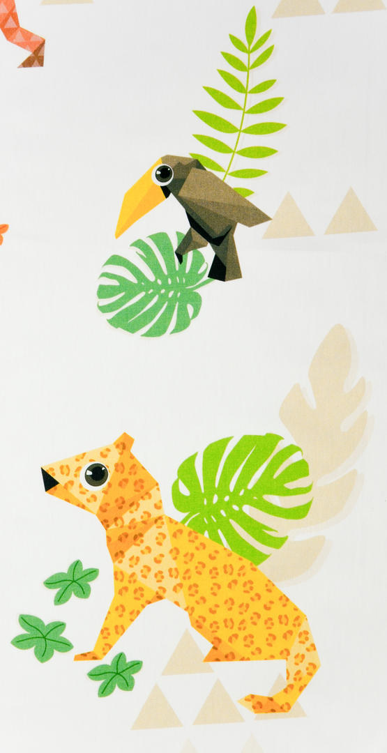Héérlijk satijnzachte stof zorgt ervoor dat dit gordijn ‘valt als een klok’. Ook het royale patroon maakt dit kindergordijn extra bijzonder. De jaguar is b.v. 18 x 20 cm groot. Dit geeft een rustig en ruimtelijk effect aan de slaapkamer. De stof is mat en de ondergrond warmwit. De jungle dieren zijn gedrukt in rustig gedekte kleuren, waardoor de tinten fraai poederig overkomen. Ideaal wanneer je een patroon wenst wat niet té veel overheerst. Voor verduistering graag even laten voeren.