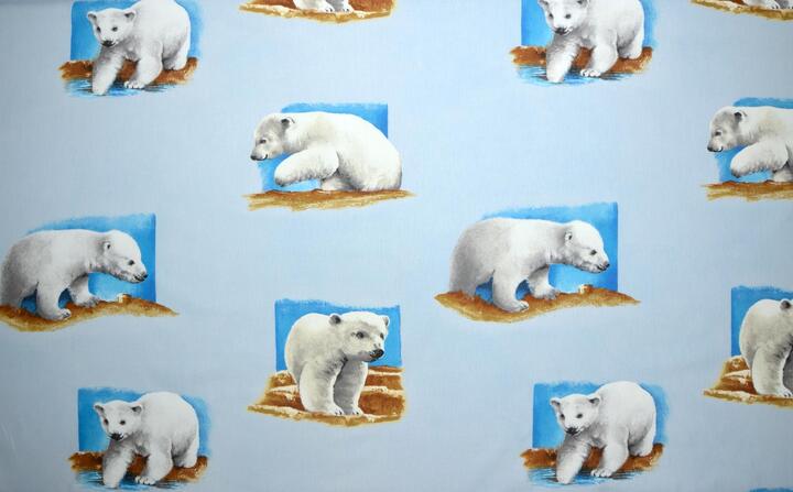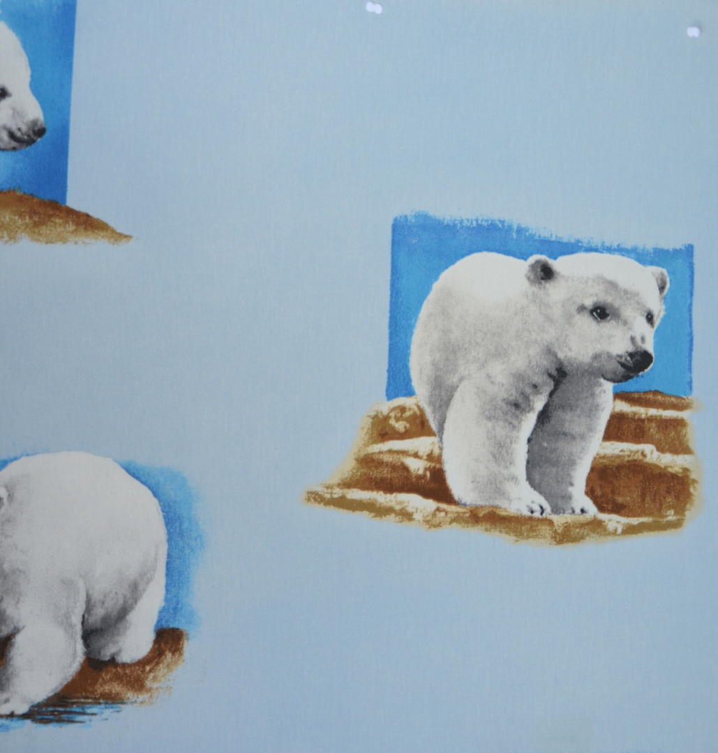Katoenen kindergordijn met ijsbeer Knut. Deze slaapverwekkende gordijnen zijn in twee verschillende pasteltinten verkrijgbaar en passen in de kinderkamer van jongens en meisjes.