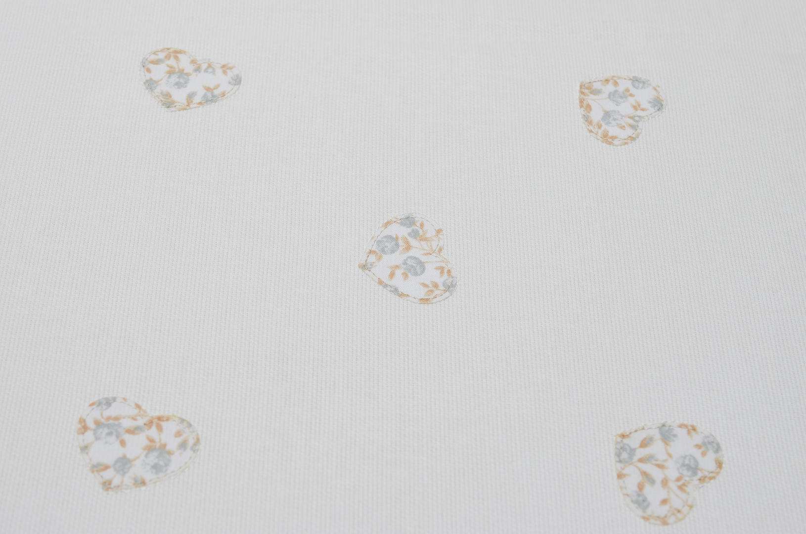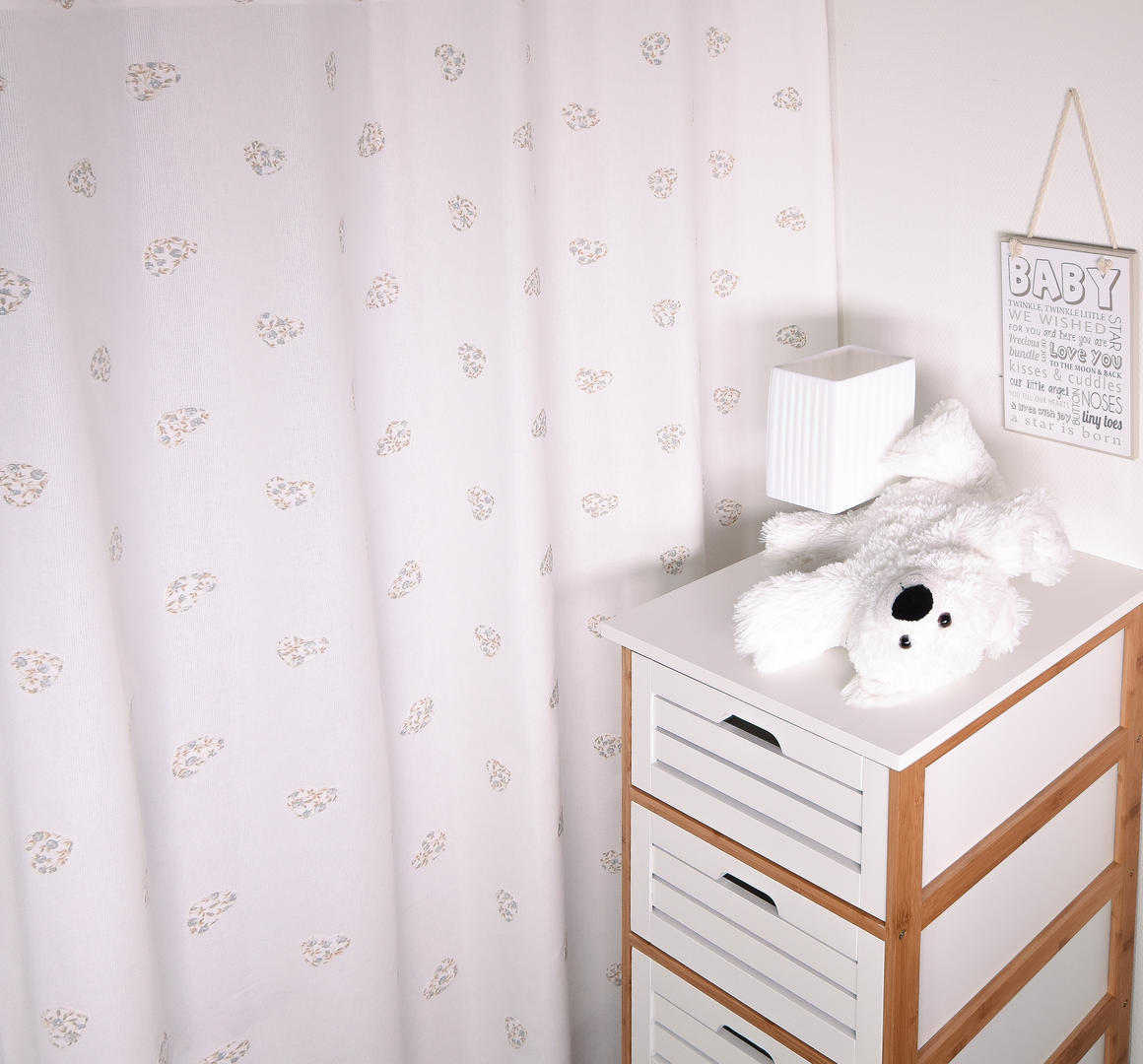 Dit is een gordijn voor de babykamer waar zachte luxe mag worden uitgestraald. Het gordijn heeft een opgestikt hartje, al dan niet met contrasterend garen. De ondergrond van de stof is warm wit en heeft een hele fijne wafeltjes structuur. Dat geeft een rijk effect. De speciaal aangebrachte hartjes geven diepte en die schattige charme. Met dit gordijn in jouw kinderkamer, eventueel met heel zachtgrijze wanden of zandkleurige muur, heb je een ‘plaat’ van een kinderkamer! (De hartjes zijn op de voorzijde gestikt en de achterzijde is wanneer gewenst te voeren voor een verduisterend effect)