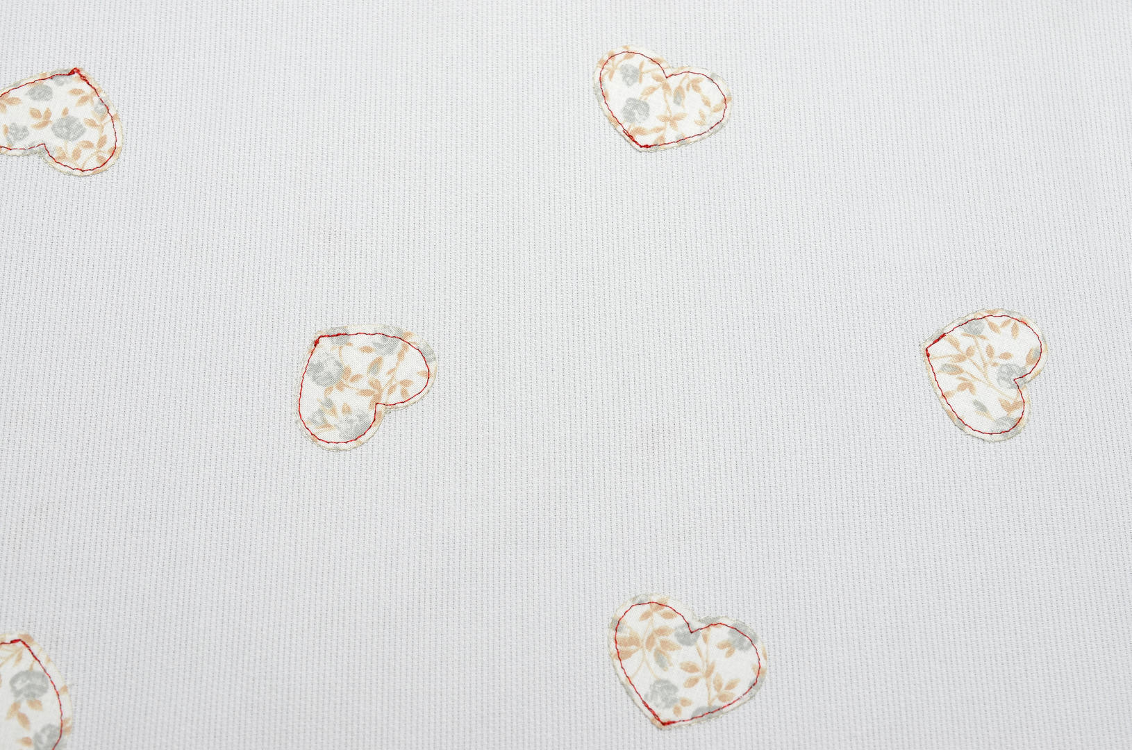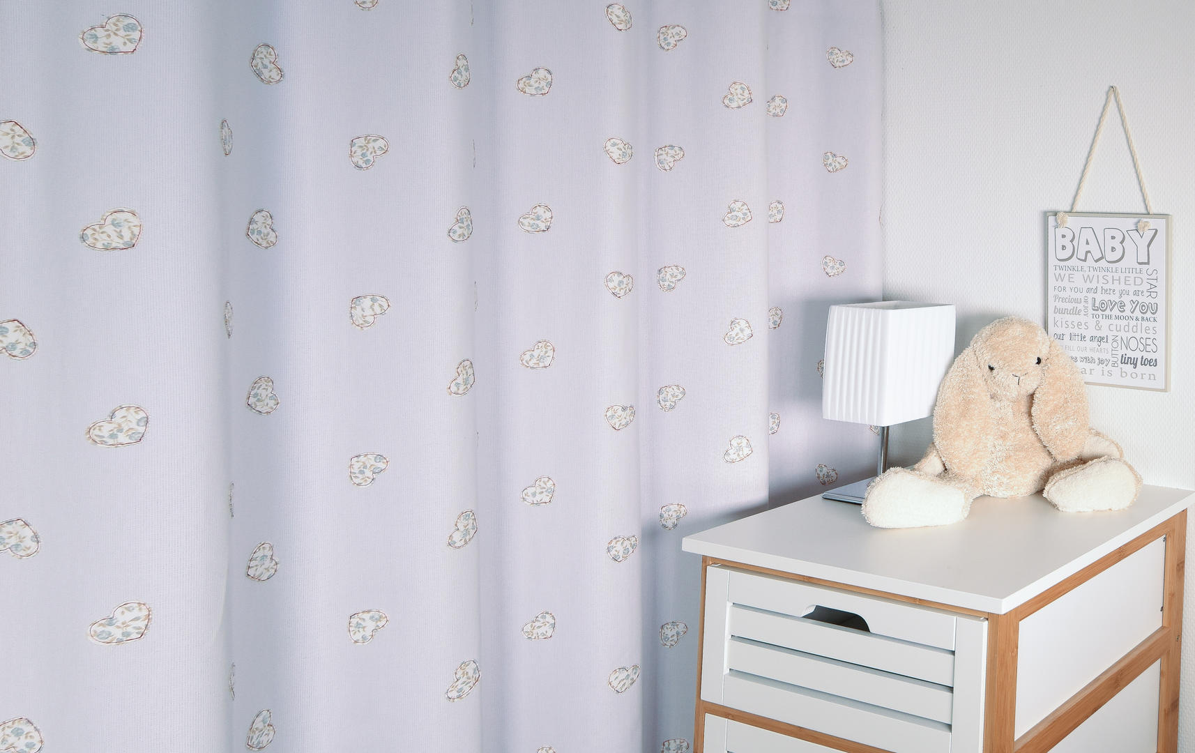 Dit is een gordijn voor de babykamer waar zachte luxe mag worden uitgestraald. Het gordijn heeft een opgestikt hartje, al dan niet met contrasterend garen. De ondergrond van de stof is warm wit en heeft een hele fijne wafeltjes structuur. Dat geeft een rijk effect. De speciaal aangebrachte hartjes geven diepte en die schattige charme. Met dit gordijn in jouw kinderkamer, eventueel met heel zachtgrijze wanden of zandkleurige muur, heb je een ‘plaat’ van een kinderkamer! (De hartjes zijn op de voorzijde gestikt en de achterzijde is wanneer gewenst te voeren voor een verduisterend effect)