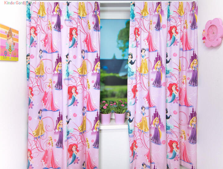 Is uw dochtertje gek op sprookjes? Al haar favoriete Disney prinsessen verzamelen zich op dit zachte katoenen kindergordijn. KinderGordijnen.nl kan ook bijpassende kussentjes leveren van dezelfde gordijnstof.