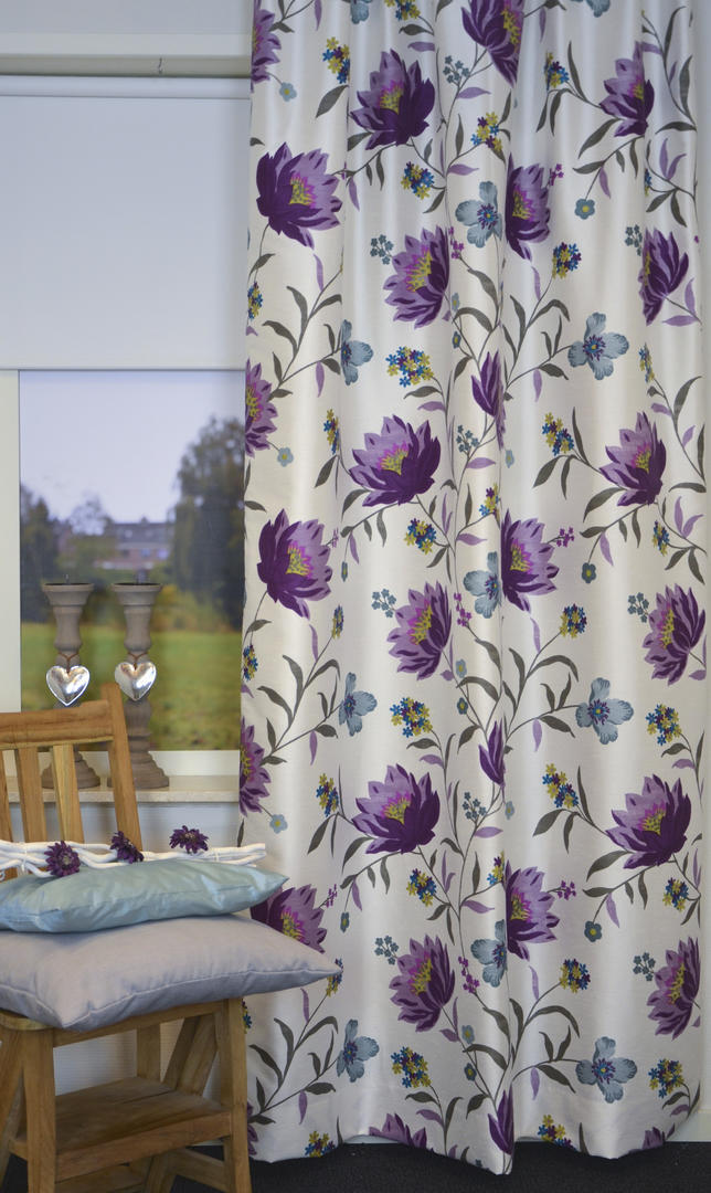 De Mills gordijnen bevatten een uitgesproken bloemenprint op structuur gordijnstof. De onregelmatige garens geven de look van wilde zijde. De bloemprint is aan de achterzijde van de stof licht zichtbaar.