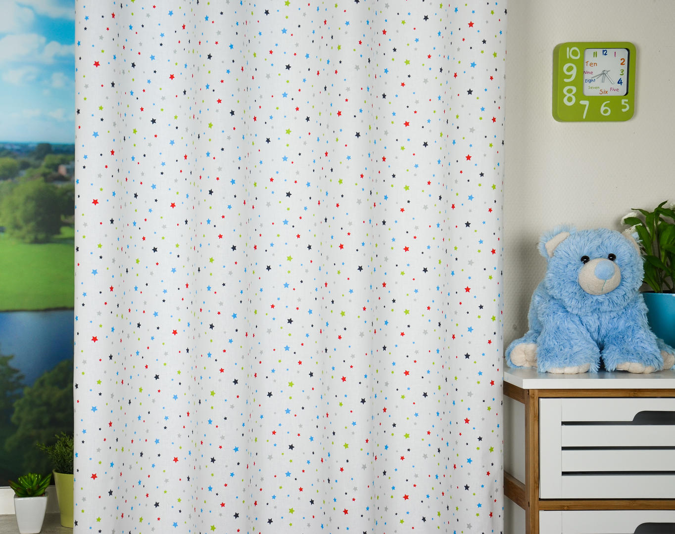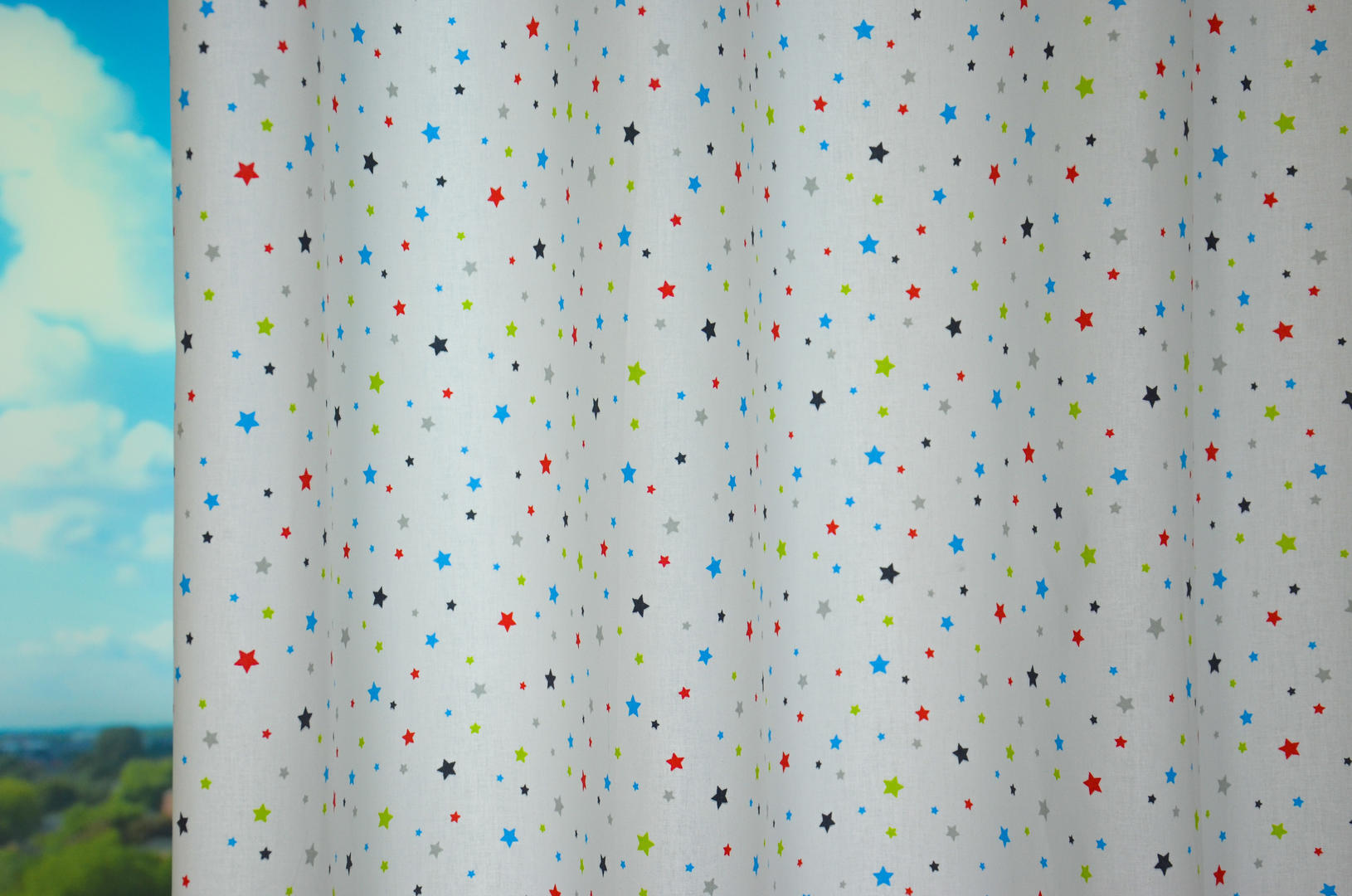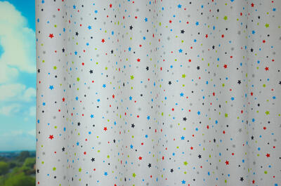 Een sterrenhemel, dat is dit gordijn! Fijn warm-wit glad geweven katoen is bedrukt met deze fonkelende sterren. De stof komt heerlijk luchtig over en is geschikt voor zowel jongens- als meisjeskamer. Natúúrlijk ook voor de babykamer als je liever geheim houdt wat “het” wordt. Een vrolijke kleur van het sterretje kan je uitstekend als muurverf kleur toepassen. Ook zachtgrijs is daarbij een prima optie. Je kunt dit gordijn combineren met een verduisterend rolgordijn of het even laten voeren.