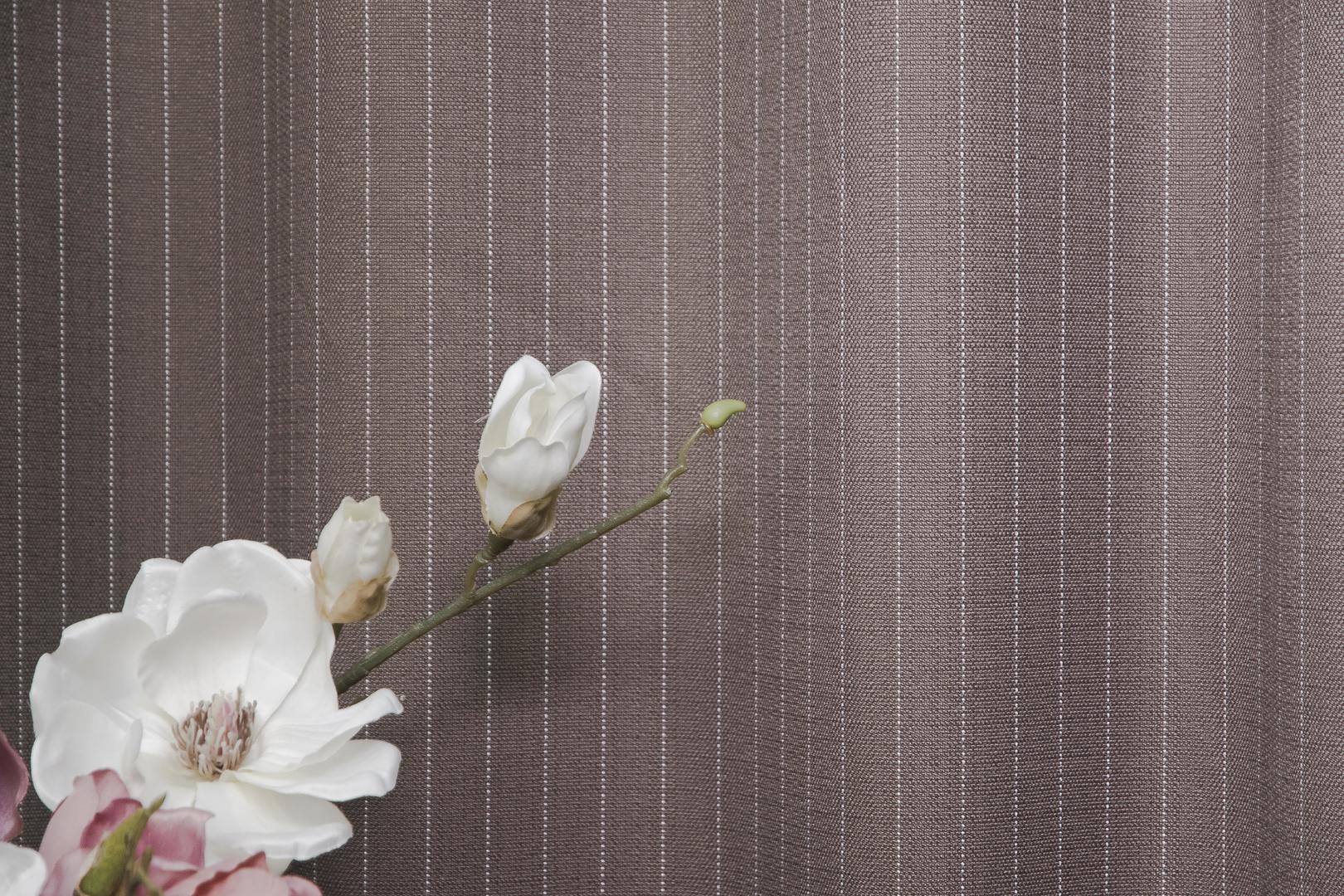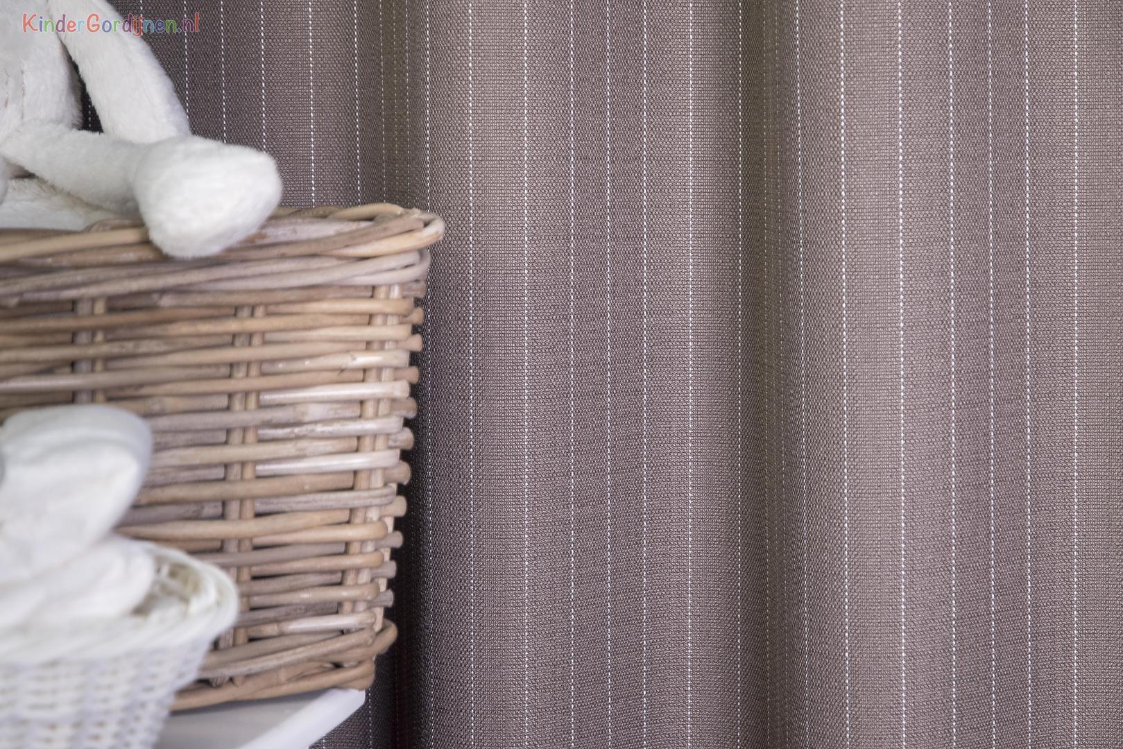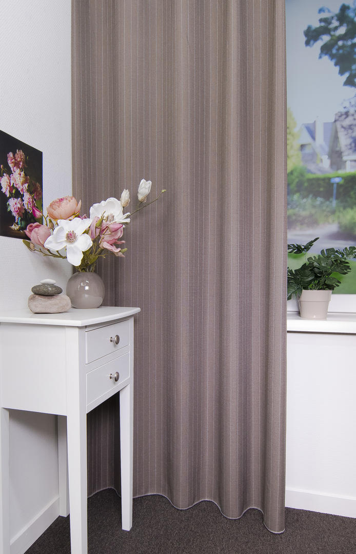 Het Pinstripe gordijn straalt rust uit, soepel taupekleurige stof met een subtiel fijn ingeweven lijntje. Wilt u het zelf zien en voelen? Bestel dan eerst een knipstaal.
