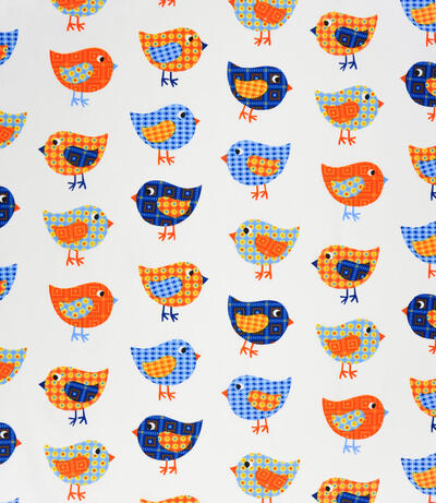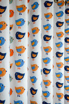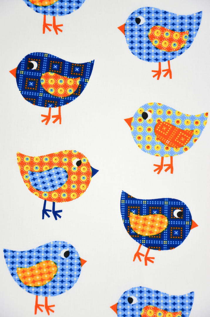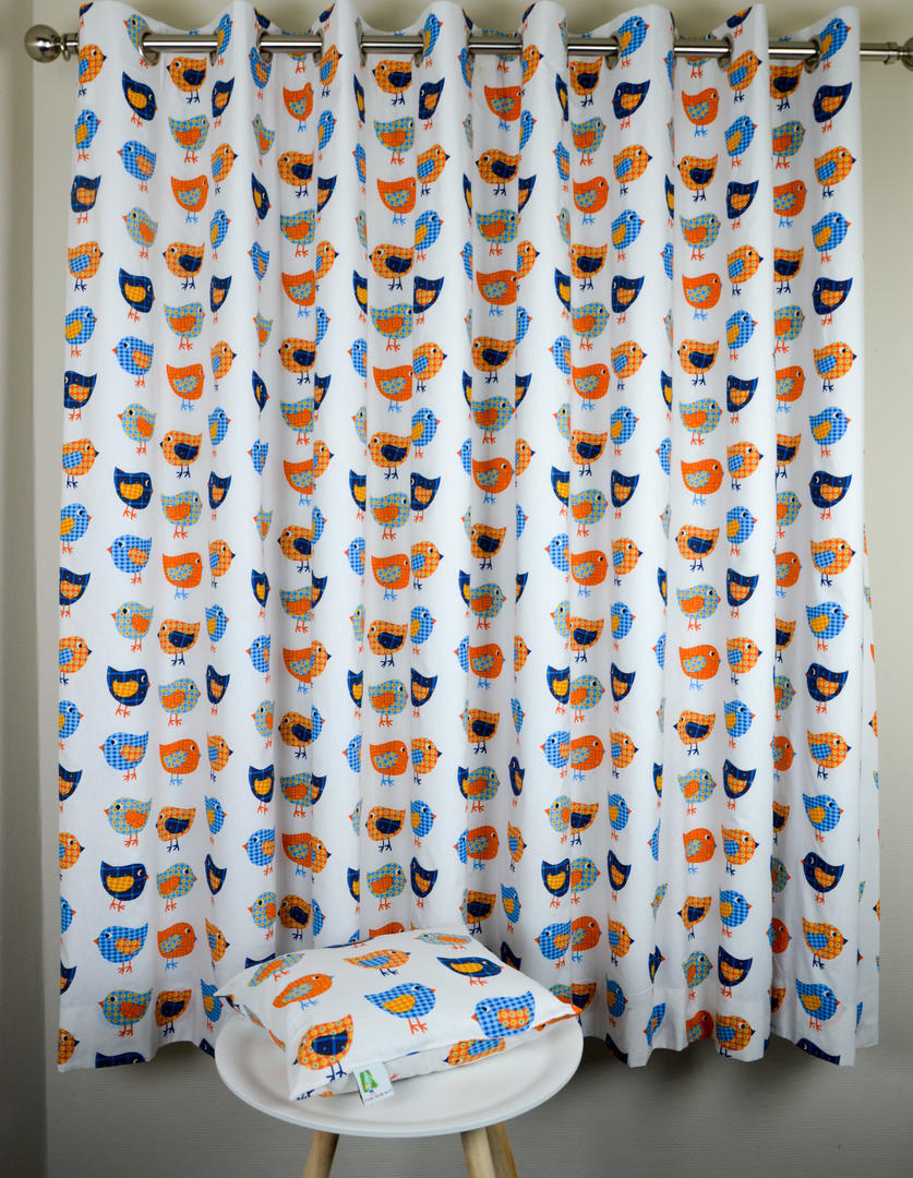 “TWEET TWEET” zegt dit nostalgische vogeltje. Je kan kiezen uit rustieke kleurcombinaties: de witte, zachtgele, poederig grijze of limoengroene ondergrond. Dat in combinatie met lavendelblauw en oranje geeft dat gezellige sfeertje uit vervlogen tijden. De stof is mat en soepel geweven, voor verduistering even voeren. Het thema kun je uitbouwen met rotan meubeltjes, een geweven rond kleed en natuurlijk één van de contrastkleurtjes op de muur.