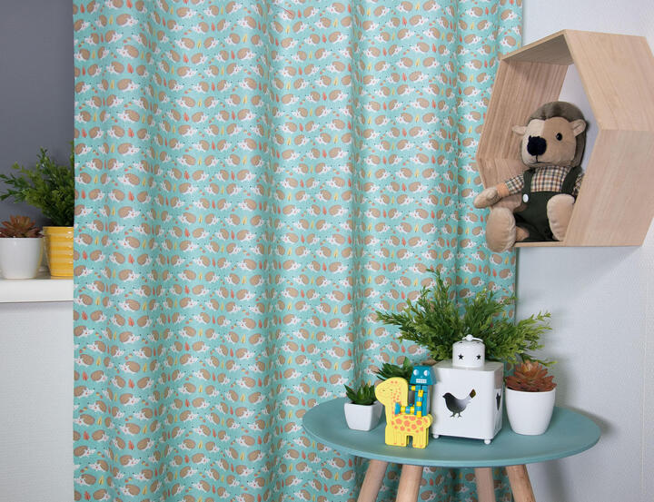 De schattige egeltjes van zo’n 4cm groot kleuren dit mint kleurige gordijn. Speels om & om gedrukt, want dat maakt het juist extra leuk! De print is op de voorzijde van de matte, fijn geweven katoen gedrukt. Voor de jongens en meisjes slaapkamer perfect te combineren met één wandje geruit- of stippenbehang. Voor verduistering kan je dit gordijn extra laten voeren. Val jij voor al deze vrolijke kraaloogjes?