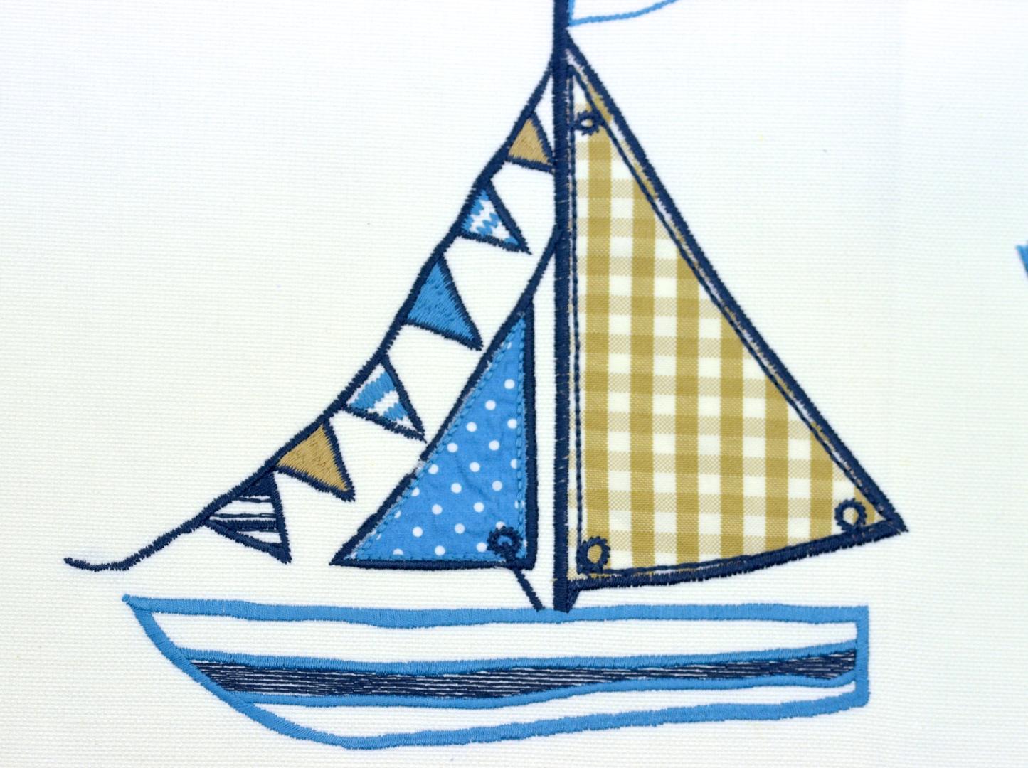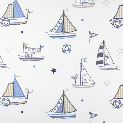 Dit is een bijzondere (nautische) gordijnstof, de scheepjes zijn er op geborduurd! Ook de zeilen zijn van echte opgestikte patchwork stof gemaakt. Dat geeft een prachtig reliëf aan deze ietwat ruw geweven katoen. Dat effect zorgt zeker voor een extra verfijnde finish aan jouw slaapkamer! Het bootje is zo'n 18 cm groot en zeilt zó jouw kamer in. Sail away Captain!