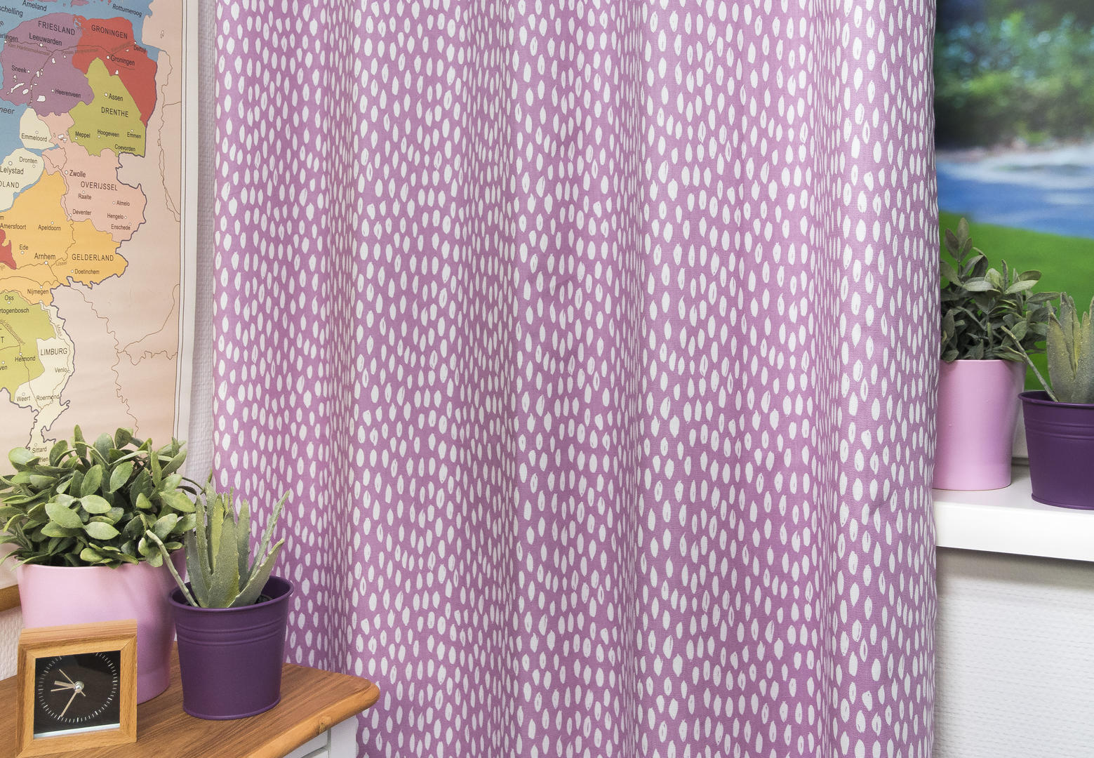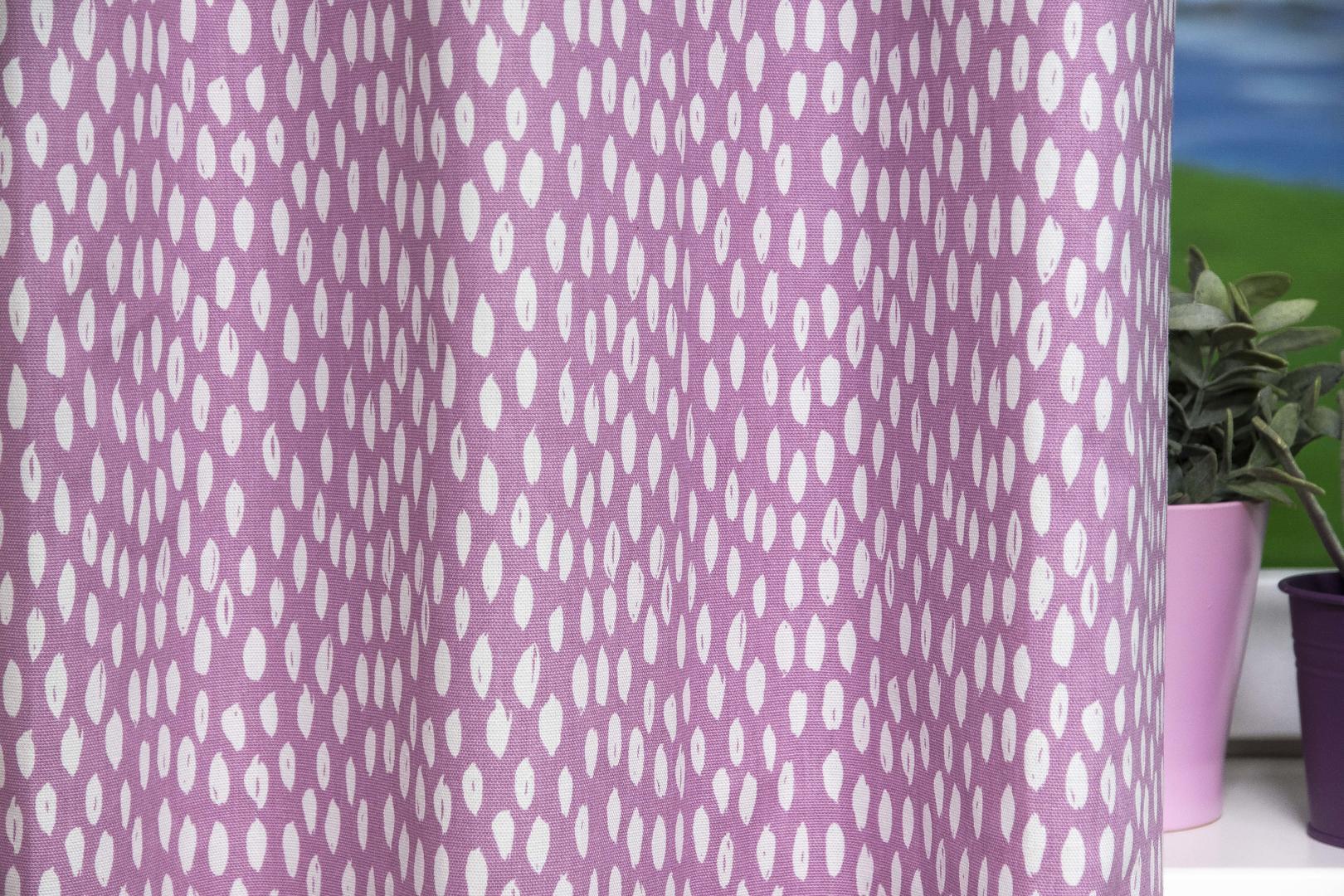 "Zachtjes tikt de regen..." De subtiele druppeltjes print op dit katoenen gordijn geeft de kinderkamer een rustgevende sfeer. Decoratief, maar toch tijdloos. Het gordijn is leverbaar in acht verschillende kleuren en daardoor geschikt voor de babykamer, meisjeskamer of jongenskamer. Het is mogelijk om verduisterende voering toe te voegen om de kamer donker te maken. Dit zorgt meteen voor extra bescherming en isolatie.