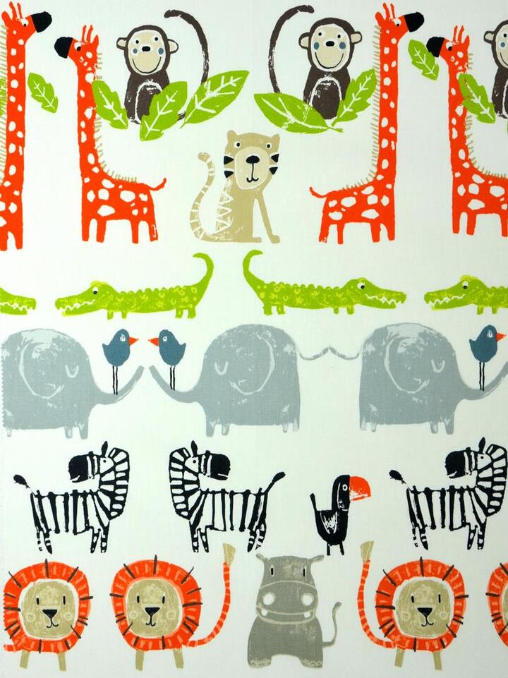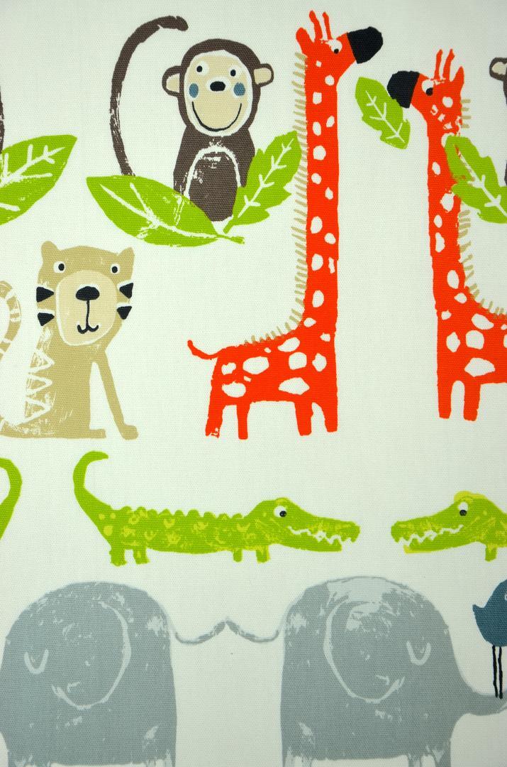 Wie wil deze vrolijke Afrikaanse dieren niet vanuit z’n bed bewonderen? Nijlpaard, leeuw en olifant, er zijn nog meer te ontdekken. De gordijnen zijn leverbaar in 2 kleuren. De beestjes zijn ongeveer 12 cm groot en gedrukt op sportieve, ruwe katoen. Alleen de giraffe is met haar ranke nek een beetje langer. Om de kinderkamer donker te maken, kan je gordijnen laten voeren.