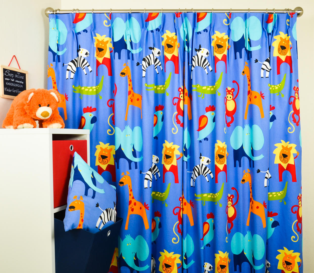 Super gave BONTE peuter- kleutergordijnen! Van krokodil tot zebra, deze dieren komen je kamer gegarandeerd opvrolijken. Meneer leeuw is 25 cm groot en mevrouw olifant zelfs nog groter. Door het royale patroon kan dit gordijn uitstekend tot de grond gemaakt worden. De dieren zijn gedrukt op sportieve, ietwat ruwe katoen en desgewenst verduisterend te voeren.