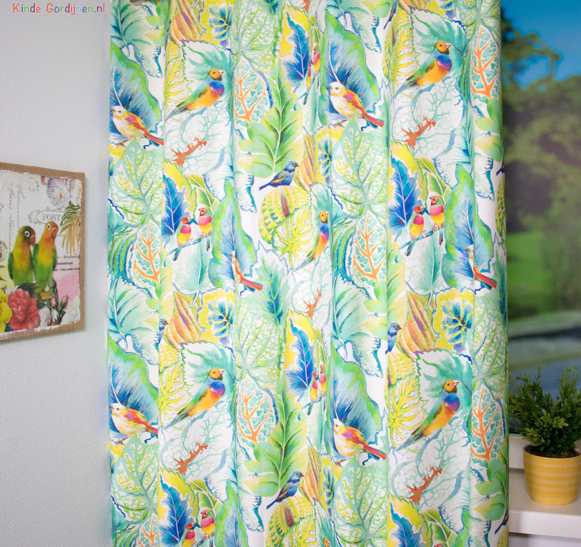 Deze gordijnstof met de naam Love Birds is gemaakt van de beste materialen waardoor het gordijn mooi in de plooi valt.