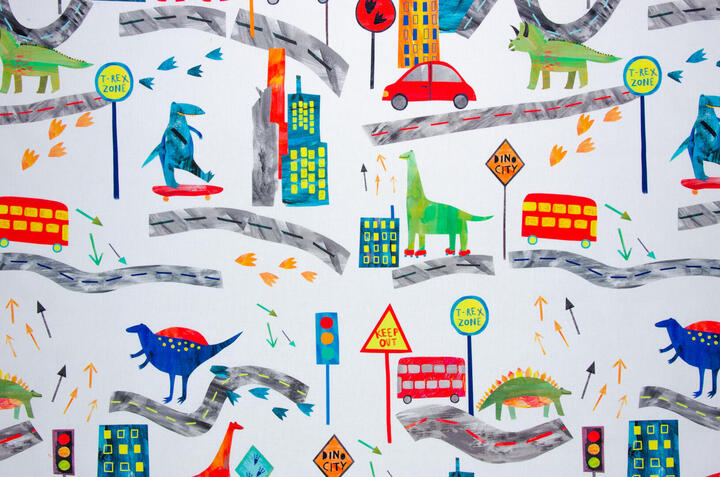 Deze gordijnstof met de naam Dino City is gemaakt van de beste materialen waardoor het gordijn mooi in de plooi valt.