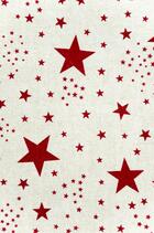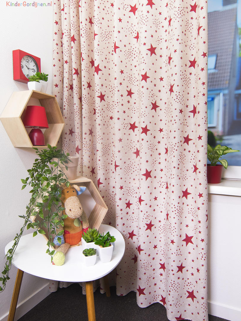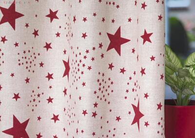 Fonkelende kamerhoge gordijnen met marineblauw of donkerrode sterren van verschillend formaat op een ietwat grijze ondergrond.