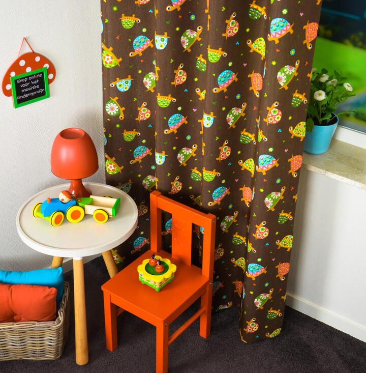 Dit decoratieve gordijn moet je eigenlijk in het écht zien! De vrolijk en kleurrijke schildpadjes zijn gedrukt op licht geribbelde stof. De stof is leverbaar in 2 verschillende warme ondergrondkleuren: linnen of nostalgisch bruin. Dat geeft extra gezelligheid aan de slaapkamer. De schildpadjes zijn 7 x 10 cm en kijken allemaal blij jouw kamer in. Riet & rotan past perfect bij dit sfeertje. Desgewenst verduisterend voeren.