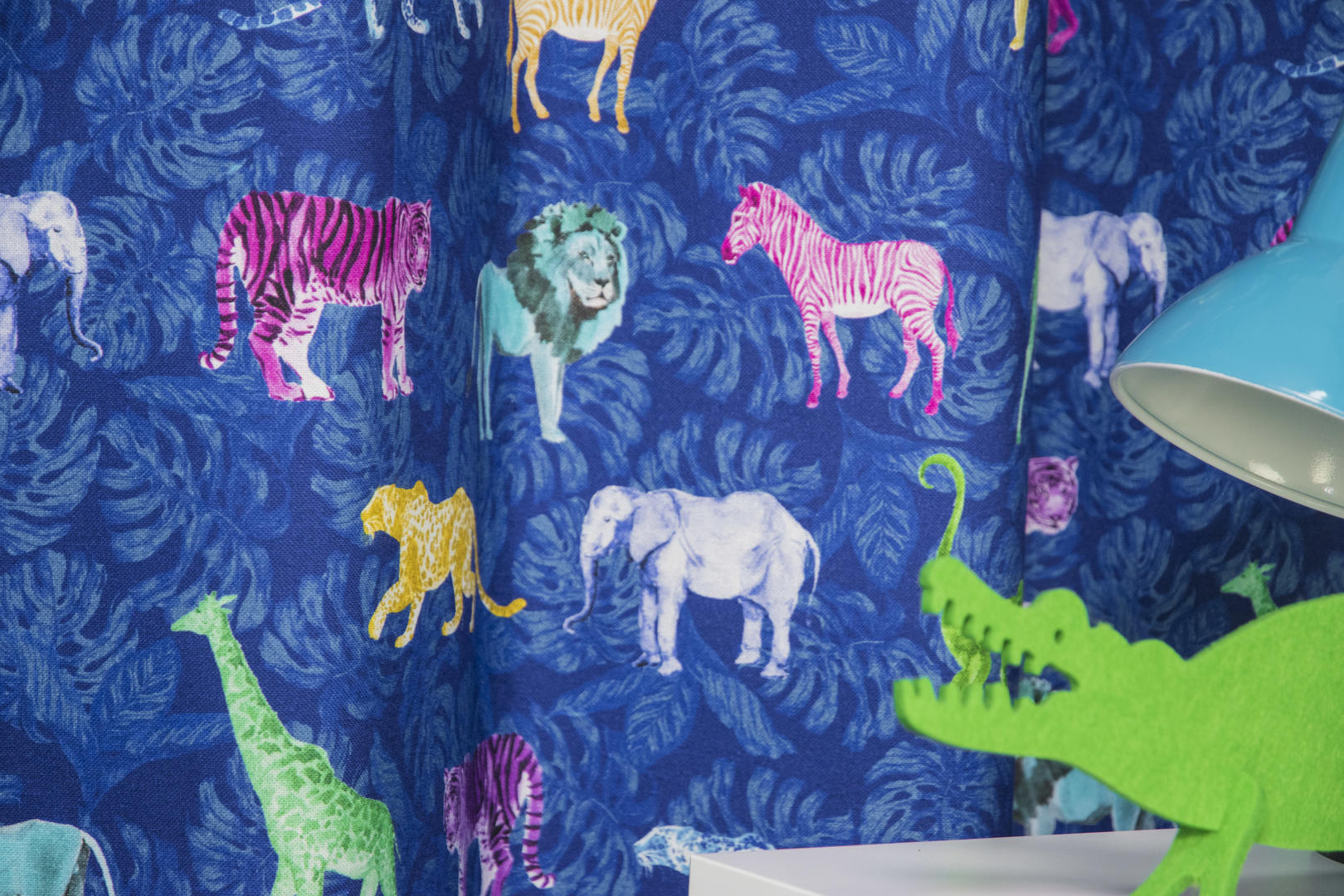 Deze gordijnstof met de naam Safari Blue is gemaakt van de beste materialen waardoor het gordijn mooi in de plooi valt.