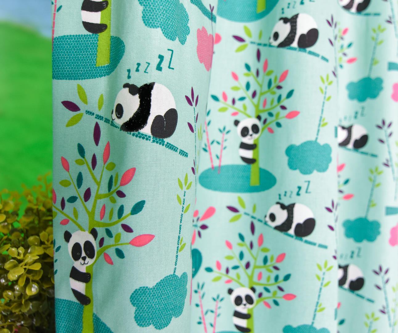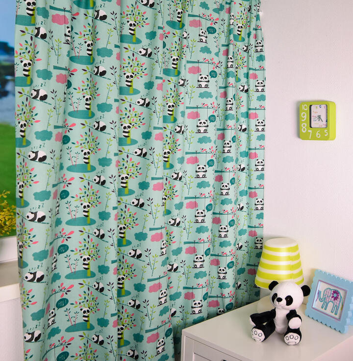 Ahhh om te smelten, wat een schattige reuzenpanda’s! In het wild leven pandaberen alleen in Azië. China om precies te zijn en daar eten zij de hele dag door verse bamboeblaadjes. Ze hebben een dikke vacht omdat de winter in de Chinese bergen erg koud is. Gelukkig heb jij vast een héérlijk warme slaapkamer voor deze berenfamilie. De panda’s zijn zo’n 5 cm groot. De gordijnstof is leverbaar in 2 frisse kleuren en kan naar wens gevoerd worden.