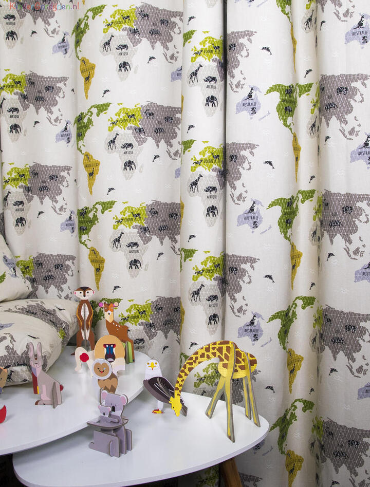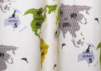 Een wereldkaartgordijn, hoe stoer is dat?! Op soepelvallende, matte katoenen stof is op de voorzijde de plattegrond van de wereld gedrukt. In zachte, rustige, vergrijsde tinten zie je duidelijk de landen en oceanen en hun ligging. Een ontzettend leuk & leerzaam gordijn want vanuit je bed kan je over verre reizen fantaseren. De stof is leverbaar in 2 kleurvariaties: een camelgrijze ondergrond of een lichte petrolkleurige ondergrond. Op de landen en werelddelen staan verschillende vrolijke dieren afgebeeld die je aan kunt treffen. Voor kleurbehoud van dit gave gordijn en eventueel verduistering, kun je de optie voeren aanvinken in het bestelproces. Word jij onze toekomstige globetrotter?