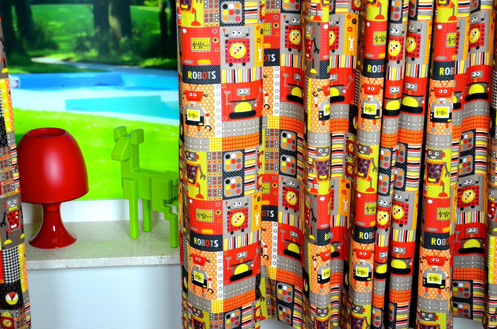 Prachtig kindergordijn voor zowel jongens als meisjes. Het Robot kindergordijn is geschikt voor alle avontuurlijke kinderen die van techniek houden! De katoenen gordijnstof is verkrijgbaar in drie verschillende bonte kleurencombinaties.
