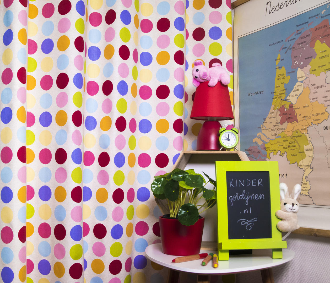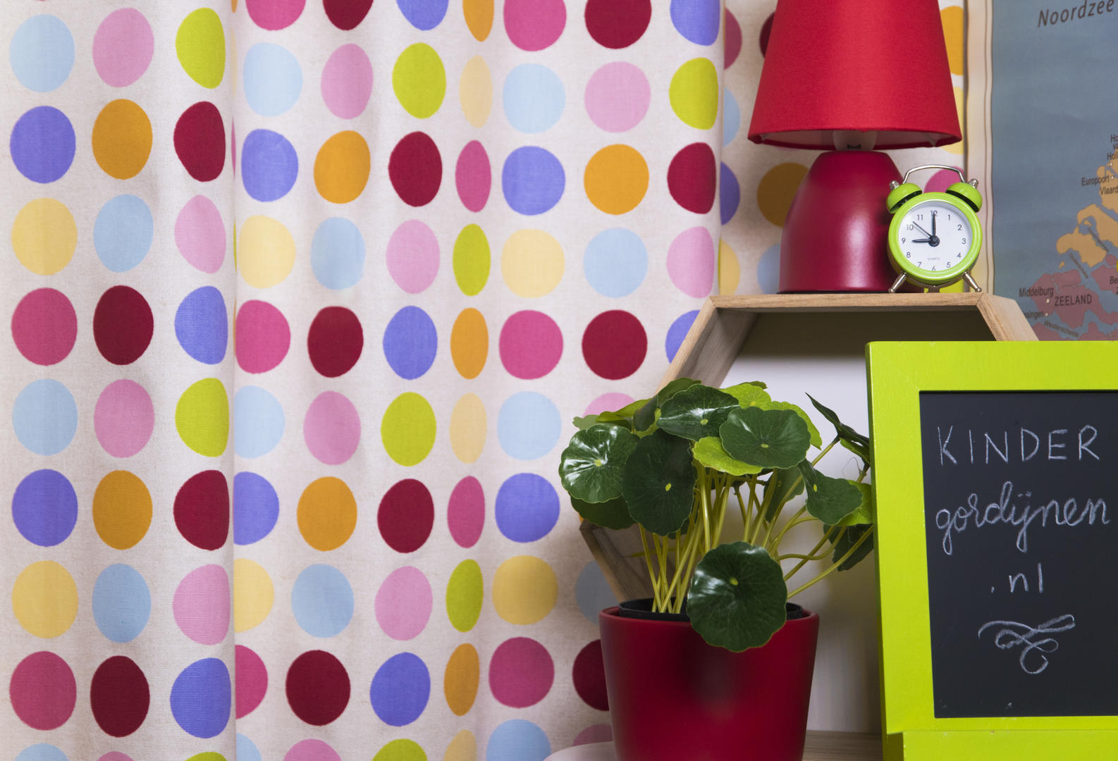Met dit kindergordijn tover je de ruimte in een handomdraai om tot een bonte en gezellige kinderkamer! Het gordijn heeft verschillende rijk gekleurde 'spots' De grote stippen van 15 cm zijn in een vast patroon gedrukt op een witte ondergrond. Een gordijn om vrolijk van te worden! De gordijnstof is van 100% katoen en kan indien gewenst (geheel) verduisterend en isolerend worden besteld, een verschil van dag en nacht!