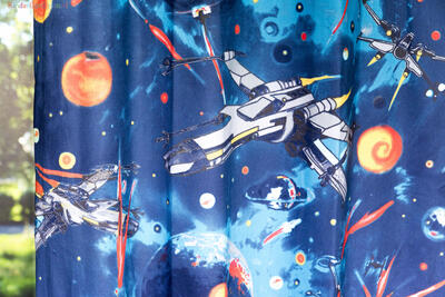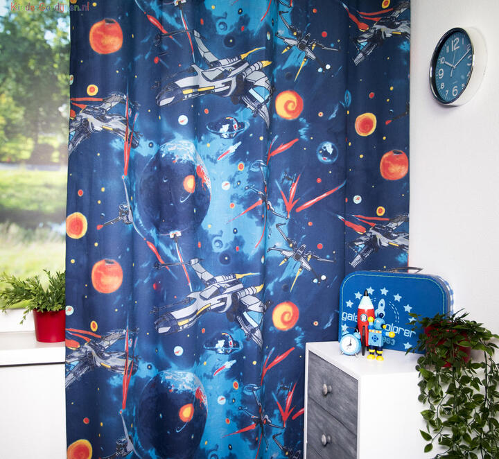 Wie kent er Star Wars niet? Met R2D2, Yoda en Luke skywalker. Maar er waren ook een paar mooie ruimteschepen in het verhaal zoals de X Wing. Deze staat heel mooi op dit kindergordijn afgebeeld. ?Het kindergordijn staat fantastisch in een kinderkamer. En het mooie is dat je hem kan laten voeren met verduisterende stof zodat je in één keer klaar bent. De stof die gebruikt is voor dit kindergordijn is 48% katoen en 52% polyester. Je vindt dit mooie kindergordijn onder de categorie kindergordijnen met print.