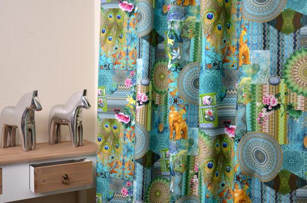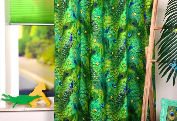 WAUW, wat blauw! Het lijkt net of je echt tussen de tropische vissen en het koraal in het kraakheldere water zwemt. Zo intens zijn de kleuren op de kindergordijnen met digital print. Alsof je erbij bent, tussen de paarden op de prairie, of in het zonnestelsel waar je Mars, Venus, de Aarde en andere planeten tegenkomt, terwijl je de sterren in de verte ziet schitteren. Wat een kleurenpracht heeft dat gordijn met al die pauwenogen! En kijk dat kleine hertje met zijn grote ogen… Met digital print ben je in je eigen kamer in een andere wereld.