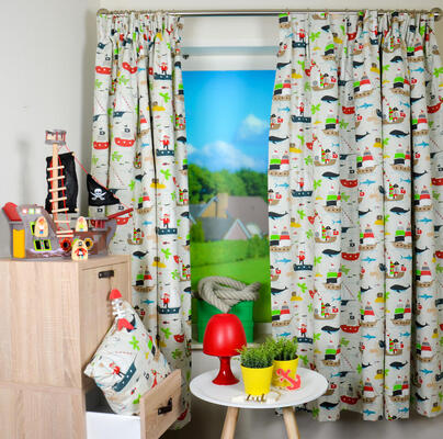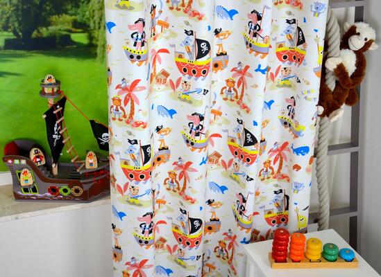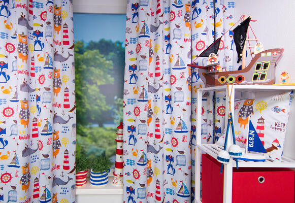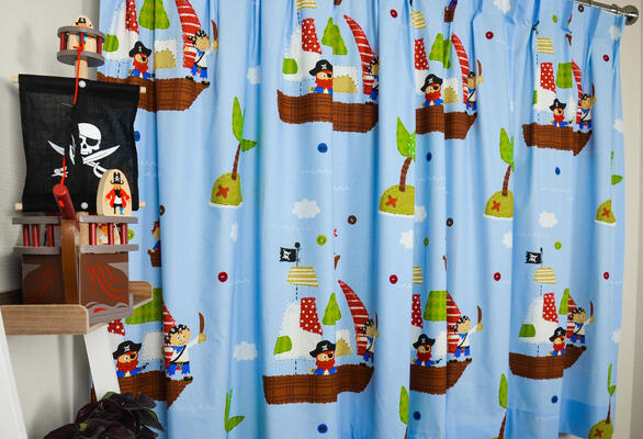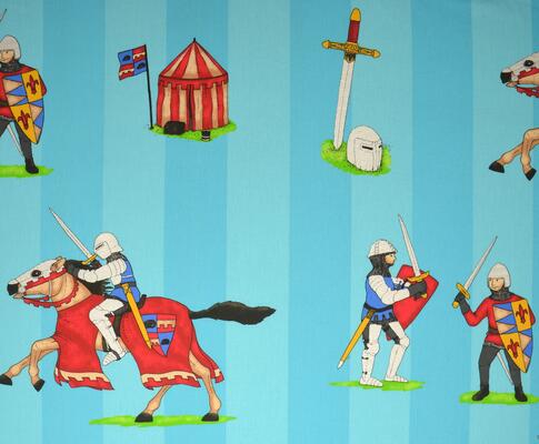 Stoere kindergordijnen voor kleine piraten en ridders. Hijs de zeilen en reis mee over de zee. Met een schatkaart op expeditie naar onbekend gebied. Woeste baaien vol goudstukken, juwelen, skeletten en pistolen. Of zadel je paard en trek van kasteel naar kasteel. Met schild en zwaard op weg naar de overwinning.