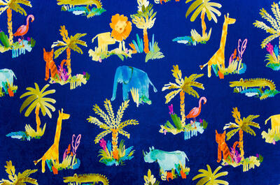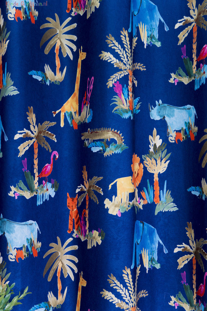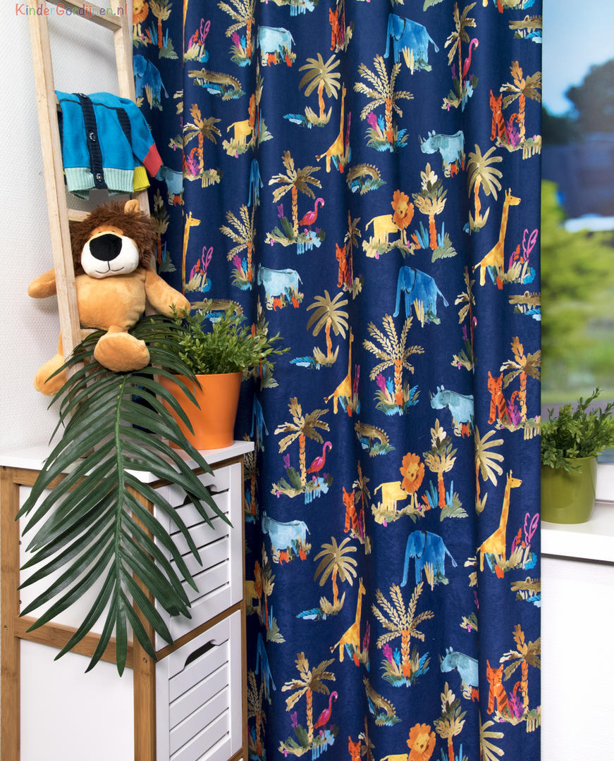 Een TOPPERTJE, dat is dit kindergordijn! Vrolijke dieren zijn afgebeeld op strelend zachte stof. De print is leverbaar in 3 ondergrondkleuren, een warm-wit, lichtblauw en donkerblauw. De safari dieren zijn met een vlotte penseel techniek als het ware geschilderd op de gordijnstof. Dat geeft een speels effect. De flamingo is 8 cm groot, de palmboom zo’n 18 cm. De achterzijde van de stof is egaal gebroken wit. Zie jij dit kindergordijn al voor je? Er is zoveel leuks op te zien en de stof kan desgewenst worden verduisterd met een verduisterende voering.
