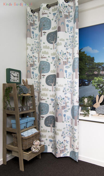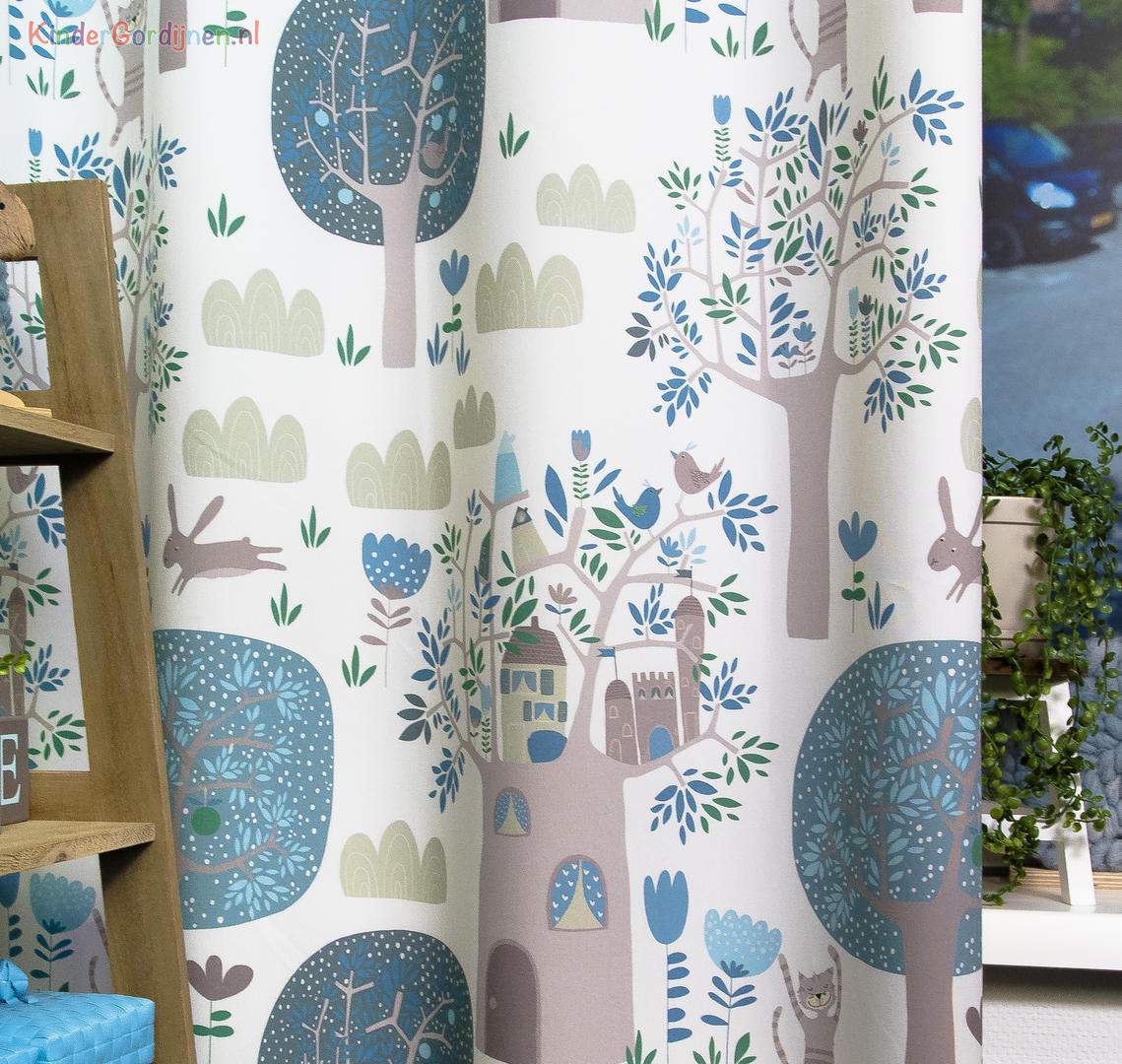 Bijzonder soepel en fijn geweven gordijnstof met boomhuis dessin. De stof is deels gemaakt van gerecyclede garens. De print is waterbesparend.