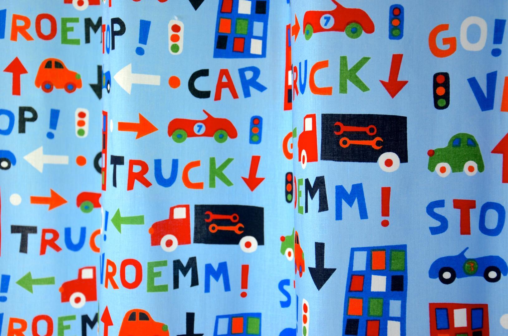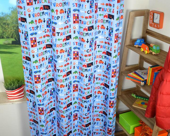 Decoratief jongensgordijn met autootjes voor de kleine man! Het patroon is gedrukt op een fris blauwe, matte ondergrond. De stof is kamerhoog, dus voor deze meterprijs kan het gordijn zelfs tot de grond! De vrachtwagen is 11 x 4 cm en de flat 8 cm hoog. De vrolijke primaire kleuren geven écht dat kinderkamersfeertje. De stof is luchtig, dus goed te combineren met een (verduisterend) rolgordijn of even laten voeren.