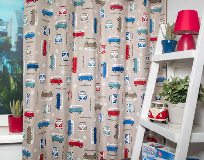 VW Transporter retro gordijnstof is een stof met een afbeeldingen van VW T1's  in een verschillende kleuren.